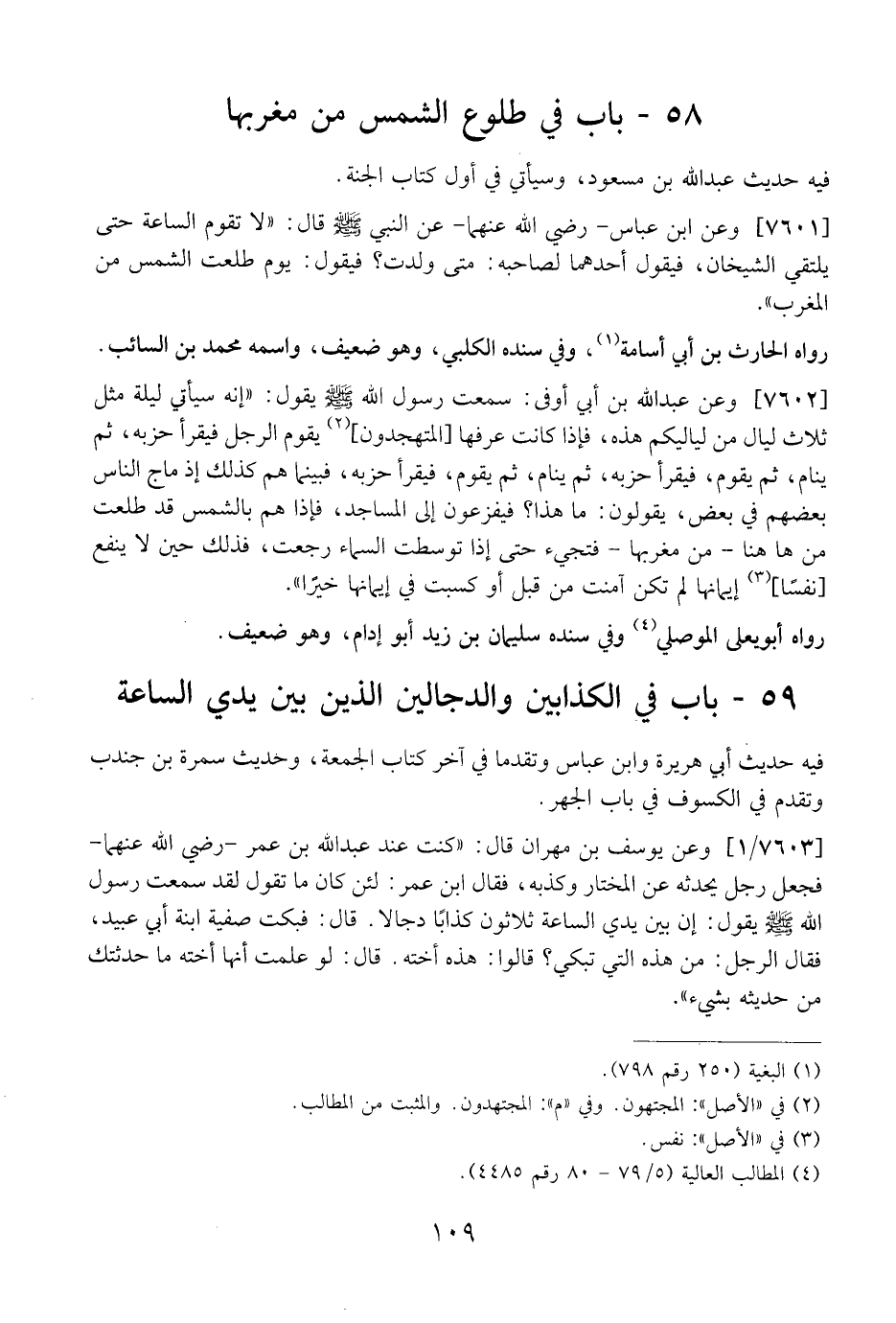 7602 - وَعَنْ عَبْدِ اللَّهِ بْنِ أَبِي أَوْفَى: سَمِعْتُ رَسُولَ اللَّهِ - صَلَّى اللَّهُ عَلَيْهِ وَسَلَّمَ -يَقُولُ: "إِنَّهُ سَيَأْتِي لَيْلَةٌ مِثْلُ ثَلَاثِ لَيَالٍ مِنْ لَيَالِيكُمْ هَذِهِ، فَإِذَا كانت عرفها المتهجدون يَقُومُ الرَّجُلُ فَيَقْرَأُ حِزْبَهُ، ثُمَّ يَنَامُ، ثُمَّ يَقُومُ، فَيَقْرَأُ حِزْبَهُ، ثُمَّ يَنَامُ، ثُمَّ يَقُومُ، فَيَقْرَأُ حِزْبَهُ، فَبَيْنَمَا هُمْ كَذَلِكَ إِذْ مَاجَ النَّاسُ بَعْضُهُمْ فِي بَعْضٍ، يَقُولُونَ: مَا هَذَا؟ فَيَفْزَعُونَ إِلَى الْمَسَاجِدِ، فَإِذَا هُمْ بِالشَّمْسِ قَدْ طلعت من ها هنا- مِنْ مَغْرِبِهَا- فَتَجِيء حَتَّى إِذَا تَوَسَّطَتِ السَّمَاءَ رَجَعَتْ، فَذَلِكَ حِينَ لَا يَنْفَعُ نَفْسًا إِيمَانُهَا لَمْ تَكُنْ آمَنَتْ مِنْ قَبْلُ أَوْ كَسَبَتْ في إيمانها خيًرا".
