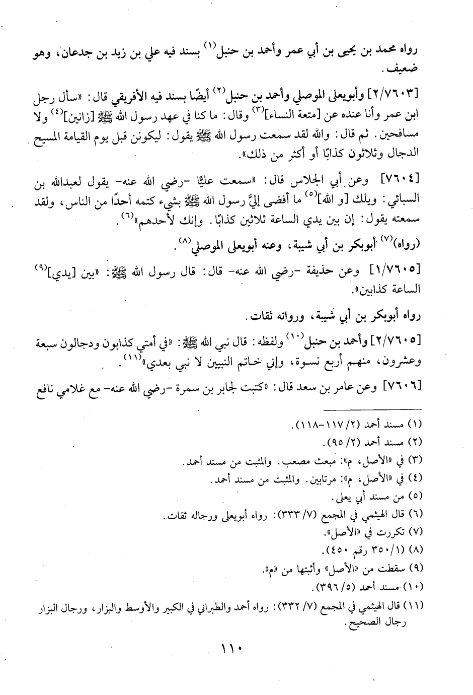 7603 / 2 - وَأَبُو يَعْلَى الموصلي وَأَحْمَدُ بْنُ حَنْبَلٍ أَيْضًا بِسَنَدٍ فِيهِ الْأَفْرِيقِيُّ قَالَ: "سَأَلَ رَجُلٌ ابْنَ عُمَرَ وَأَنَا عِنْدَهُ عن أمتعة النساء وَقَالَ: مَا كُنَّا فِي عَهْدِ رَسُولِ اللَّهِ - صَلَّى اللَّهُ عَلَيْهِ وَسَلَّمَ - زانين وَلَا مُسَافِحِينَ. ثُمَّ قَالَ: وَاللَّهِ لَقَدْ سَمِعْتُ رَسُولَ اللَّهِ- صَلَّى اللَّهُ عَلَيْهِ وسلم - يقول: لَيَكُونَنَّ قَبْلَ يَوْمِ الْقِيَامَةِ الْمَسِيحُ الدَّجَّالُ وَثَلَاثُونَ كَذَّابًا أَوْ أَكْثَرُ مِنْ ذَلِكَ".
