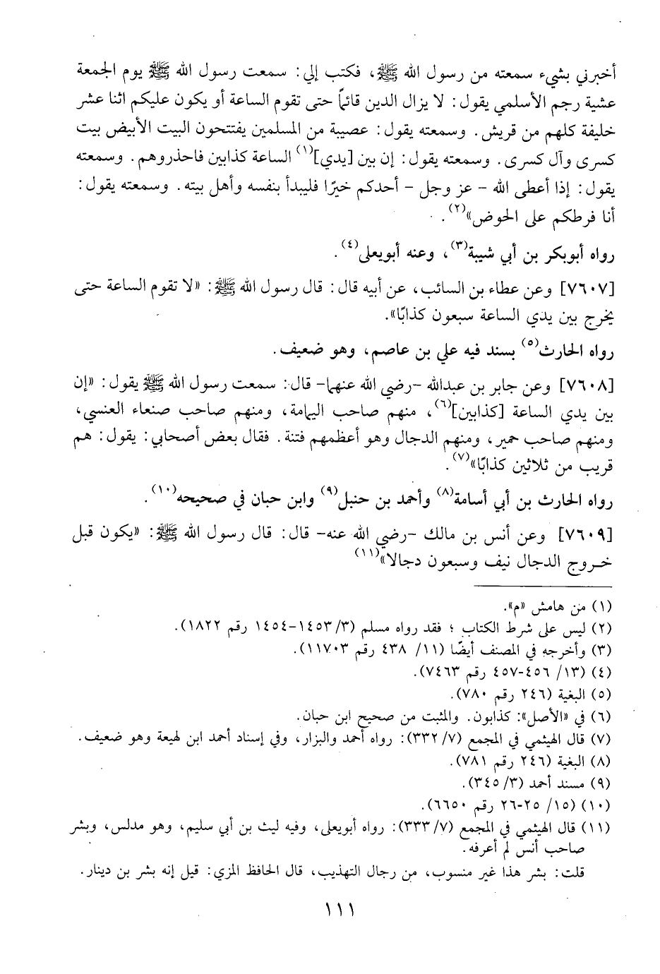 7608 - وَعَنْ جَابِرِ بْنِ عَبْدِ اللَّهِ- رَضِيَ اللَّهُ عَنْهُمَا- قَالَ: سَمِعْتُ رَسُولَ اللَّهِ - صَلَّى اللَّهُ عَلَيْهِ وسلم -يقول: "إن بين يدي الساعة كذابين، مِنْهُمْ صَاحِبُ الْيَمَامَةِ، وَمِنْهُمْ صَاحِبُ صَنْعَاءَ الْعَنْسِيُّ، وَمِنْهُمْ صَاحِبُ حِمْيَرَ، وَمِنْهُمْ الدَّجَّالُ وَهُوَ أَعْظَمُهُمْ فِتْنَةً. فَقَالَ بَعْضُ أَصْحَابِي: يَقُولُ: هُمْ قَرِيبٌ مِنْ ثَلَاثِينَ كَذَّابًا".