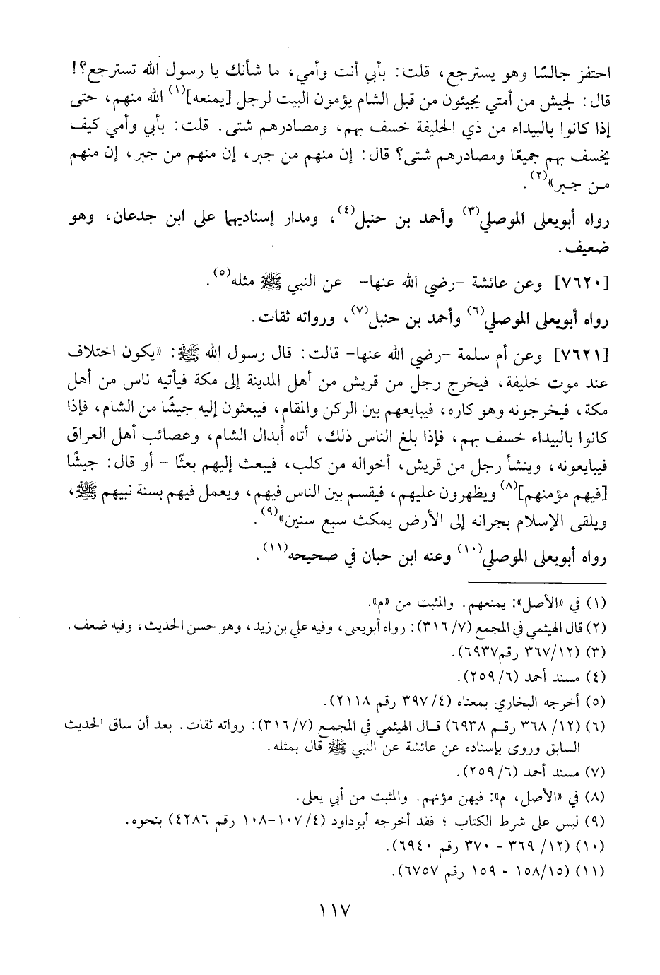 7621 - وَعَنْ أُمِّ سَلَمَةَ- رَضِيَ اللَّهُ عَنْهَا- قَالَتْ: قَالَ رَسُولُ اللَّهِ - صَلَّى اللَّهُ عَلَيْهِ وسلم -: "يَكُونُ اخْتَلَافٌ عِنْدَ مَوْتِ خَلِيفَةٍ، فَيَخْرُجُ رَجُلٌ من قريش من أهل المدينة إلى مكة فَيَأْتِيهِ نَاسٌ مِنْ أَهْلِ مَكَّةَ، فَيُخْرِجُونَهُ وَهُوَ كَارِهٌ، فَيُبَايِعُهُمْ بَيْنَ الرُّكْنِ وَالْمَقَامِ، فَيَبْعَثُونَ إِلَيْهِ جَيْشًا مِنَ الشَّامِ، فَإِذَا كَانُوا بِالْبَيْدَاءِ خُسِفَ بِهِمْ، فَإِذَا بَلَغَ النَّاسَ ذَلِكَ، أَتَاهُ أَبْدَالُ الشَّامِ، وَعَصَائِبُ أَهْلِ الْعِرَاقِ فَيُبَايِعُونَهُ، وَيَنْشَأُ رَجُلٌ مِنْ قُرَيْشٍ، أَخْوَالُهُ مِنْ كَلْبٍ، فَيَبْعَثُ إِلَيْهِمْ بعثًا- أو قال: جيشًا فيهم مؤمنهم وَيَظْهَرُونَ عَلَيْهِمْ، فَيَقْسِمُ بَيْنَ النَّاسِ فِيهِمْ، وَيَعْمَلُ فيهم بسنة نبيهم أو، وَيُلْقِي الْإِسْلَامُ بِجِرَانِهِ إِلَى الْأَرْضِ يَمْكُثُ سَبْعَ سِنِينَ".