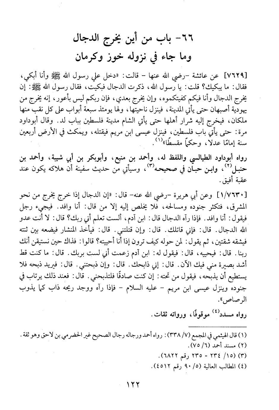 7629 - عَنْ عَائِشَةَ- رَضِيَ اللَّهُ عَنْهَا- قَالَتْ: "دَخَلَ عَلَيَّ رَسُولُ اللَّهِ - صَلَّى اللَّهُ عَلَيْهِ وَسَلَّمَ -وَأَنَا أَبْكِي، فَقَالَ: مَا يُبْكِيكِ؟ قُلْتُ: يَا رَسُولَ اللَّهِ، ذَكَرْتُ الدَّجَّالَ فَبَكَيْتُ، فَقَالَ رَسُولُ اللَّهِ - صَلَّى اللَّهُ عَلَيْهِ وَسَلَّمَ -: إِنْ يَخْرُجِ الدَّجَّالُ وَأَنَا فِيكُمْ كفيتكموه، وَإِنْ يَخْرُجْ بَعْدِي، فَإِنَّ رَبَّكُمْ لَيْسَ بِأَعْوَرَ، إِنَّهُ يَخْرُجُ مِنْ يَهُودِيَّةِ أَصْبَهَانَ حَتَّى يَأْتِيَ الْمَدِينَةَ، فَيَنْزِلَ نَاحِيَتَهَا، وَلَهَا يَوْمَئِذٍ سَبْعَةُ أَبُوَابٍ على كل نقب منها ملكان، فيخرج إليه شِرَارُ أَهْلِهَا حَتَّى يَأْتِيَ الشَّامَ مَدِينَةَ فِلَسْطِينَ بِبَابِ لُدٍّ. وَقَالَ أَبُو دَاوُدَ مَرَّةً: حَتَّى يَأْتِيَ بَابَ فِلَسْطِينَ، فَيَنْزِلُ عيسى ابن مريم فَيَقْتُلُهُ، وَيَمْكُثُ فِي الْأَرْضِ أَرْبَعِينَ سَنَةً إِمَامًا عَدْلًا، وَحَكَمًا مُقْسِطًا".