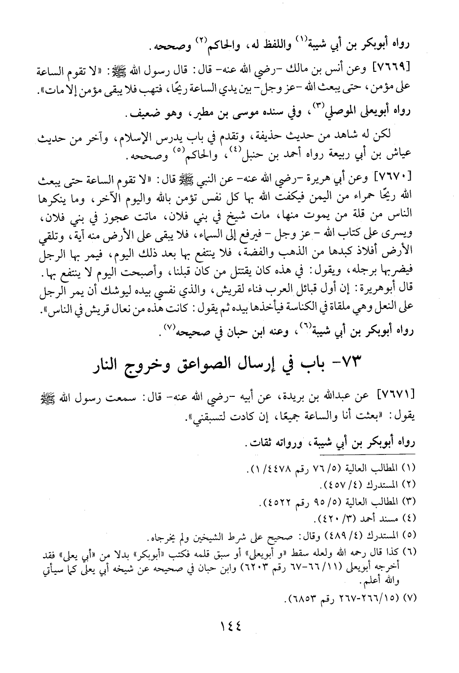 7670 - وَعَنْ أَبِي هُرَيْرَةَ- رَضِيَ اللَّهُ عَنْهُ- عَنِ النَّبِيِّ - صَلَّى اللَّهُ عليه وسلم - قَالَ: "لَا تَقُومُ السَّاعَةُ حَتَّى يَبْعَثَ اللَّهُ رِيحًا حَمْرَاءَ مِنَ الْيَمَنِ فَيَكْفِتُ اللَّهُ بِهَا كُلَّ نَفْسٍ تُؤْمِنُ بِاللَّهِ وَالْيَوْمِ الْآخِرِ، وَمَا يُنْكِرُهَا النَّاسُ مِنْ قِلَّةِ مَنْ يَمُوتُ مِنْهَا، مَاتَ شَيْخٌ فِي بَنِي فُلَانٍ، مَاتَتْ عَجُوزٌ فِي بَنِي فُلَانٍ، وَيَسْرِي عَلَى كِتَابِ اللَّهِ- عَزَّ وَجَلَّ- فَيُرْفَعُ إِلَى السَّمَاءِ، فَلَا يَبْقَى عَلَى الْأَرْضِ مِنْهُ آيَةٌ، وَتُلْقِي الْأَرْضُ أَفْلَاذُ كَبِدِهَا مِنَ الذَّهَبِ وَالْفِضَّةِ، فَلَا يُنْتَفَعُ بِهَا بَعْدَ ذَلِكَ الْيَوْمُ، فَيَمُرُّ بِهَا الرَّجُلُ فَيَضْرِبَهَا برجله، ويقول: في هذه كان يقتتل مَنْ كَانَ قَبْلَنَا، وَأَصْبَحَتِ الْيَوْمَ لَا يُنْتَفَعُ بها. قال أبو هريرة: إن أولى قَبَائِلِ الْعَرَبِ فَنَاءً لَقُرَيْشٌ، وَالَّذِي نَفْسِي بِيَدِهِ لَيُوشِكُ أَنْ يَمُرَّ الرَّجُلُ عَلَى النَّعْلِ وَهِيَ مُلْقَاةٌ فِي الْكُنَاسَةِ فَيَأْخُذَهَا بِيَدِهِ ثُمَّ يَقُولُ: كانت هذه من نِعَالُ قُرَيْشٍ فِي النَّاسِ".