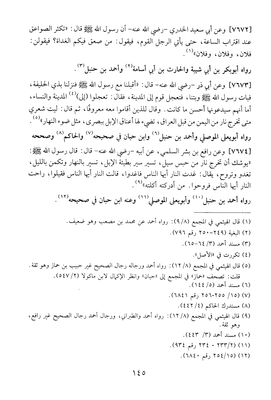 7673 - وَعَنْ أَبِي ذَرٍّ- رَضِيَ اللَّهُ عَنْهُ- قَالَ: "أَقْبَلْنَا مَعَ رَسُولِ اللَّهِ - صَلَّى اللَّهُ عَلَيْهِ وَسَلَّمَ - فَنَزَلْنَا بِذِي الْحُلَيْفَةِ، فَبَاتَ رَسُولُ اللَّهِ - صَلَّى اللَّهُ عَلَيْهِ وَسَلَّمَ - وَبِتْنَا، فَتَعَجَّلَ قَوْمٌ إِلَى الْمَدِينَةِ، فَقَالَ: تَعَجَّلُوا (إِلَى) الْمَدِينَةِ وَالنِّسَاءِ، أَمَا إِنَّهُمْ سَيَدَعُونَهَا أَحْسَنَ مَا كَانَتْ. وَقَالَ لِلَّذِينَ أَقَامُوا مَعَهُ مَعْرُوفًا، ثُمَّ قَالَ: لَيْتَ شِعْرِي مَتَى تَخْرُجُ نَارٌ مِنَ اليمن من قبل العراق، تضيء لَهَا أَعْنَاقَ الْإِبِلِ بِبُصْرَى، مِثْلُ ضَوْءِ النَّهَارِ". رَوَاهُ أَبُو يَعْلَى الْمَوْصِلِيُّ وَأَحْمَدُ بْنُ حَنْبَلٍ وَابْنُ حِبَّانَ فِي صَحِيحِهِ وَالْحَاكِمُ وَصَحَّحَهُ.