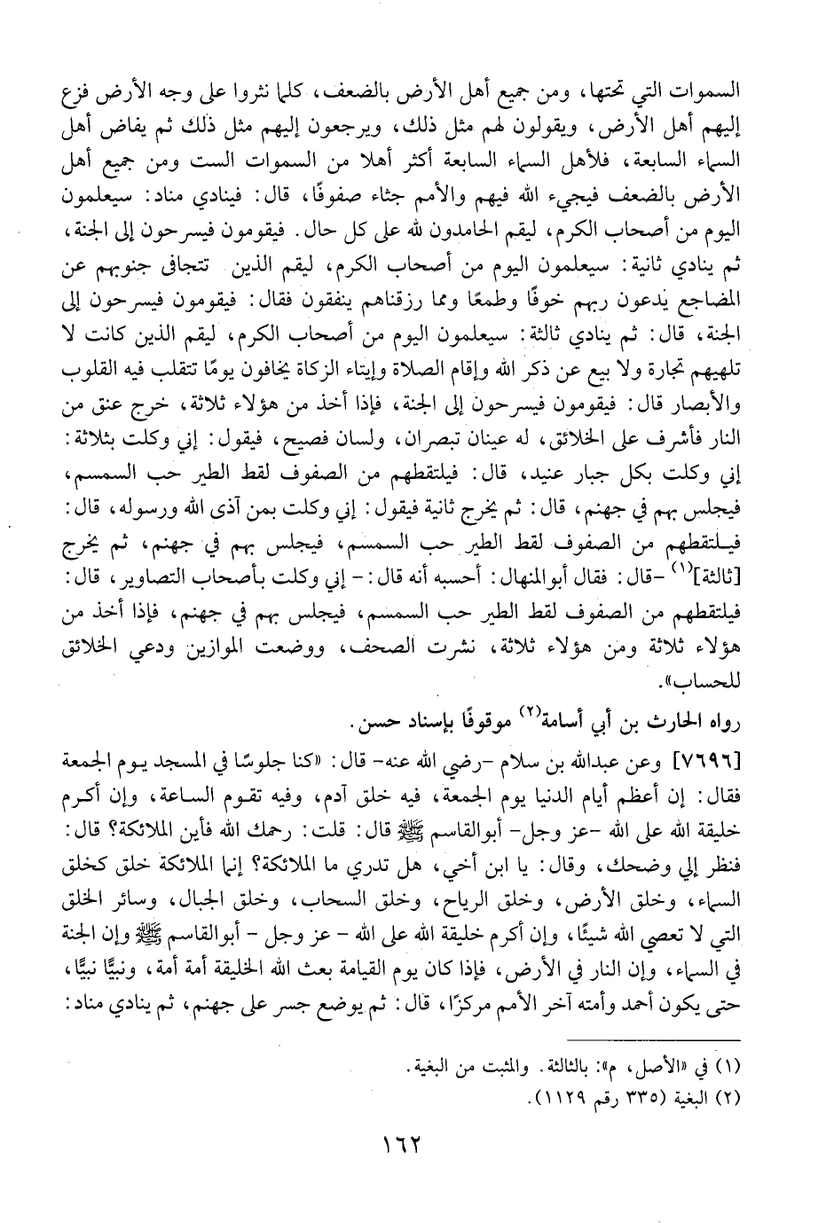 7696 - وَعَنْ عَبْدِ اللَّهِ بْنِ سَلَامٍ- رَضِيَ اللَّهُ عَنْهُ- قَالَ: "كُنَّا جُلُوسًا فِي الْمَسْجِدِ يَوْمَ الْجُمُعَةِ فَقَالَ: إِنَّ أَعْظَمَ أَيَّامِ الدُّنْيَا يَوْمُ الْجُمُعَةِ، فِيهِ خُلِقَ آدَمُ، وَفِيهِ تَقُومُ السَّاعَةُ، وَإِنَّ أَكْرَمَ خَلِيقَةَ اللَّهِ عَلَى اللَّهِ- عَزَّ وَجَلَّ- أَبُو الْقَاسِمِ - صَلَّى اللَّهُ عَلَيْهِ وَسَلَّمَ -قَالَ: قُلْتُ: رَحِمَكَ اللَّهُ فَأَيْنَ الْمَلَائِكَةُ؟ قَالَ: فَنَظَرَ إِلَيَّ وَضَحِكَ، وَقَالَ: يَا ابْنَ أَخِي، هَلْ تَدْرِي مَا الْمَلَائِكَةُ؟ إِنَّمَا الْمَلَائِكَةُ خَلْقٌ كَخَلْقِ السَّمَاءِ، وَخَلْقِ الْأَرْضِ، وَخَلْقِ الرِّيَاحِ، وَخَلْقِ السَّحَابِ، وَخَلْقِ الْجِبَالِ، وَسَائِرِ الْخَلْقِ الَّتِي لَا تَعْصَى اللَّهَ شَيْئًا، وَإِنَّ أَكْرَمَ خَلِيقَةَ اللَّهِ عَلَى اللَّهِ- عَزَّ وَجَلَّ- أَبُو القَاسِمِ - صَلَّى اللَّهُ عَلَيْهِ وَسَلَّمَ - وَأَنَّ الْجَنَّةَ فِي السَّمَاءِ، وَأَنَّ النَّارَ فِي الْأَرْضِ، فَإِذَا كَانَ يَومُ الْقِيَامَةِ بَعَثَ اللَّهُ الْخَلِيقَةَ أُمَّةً أُمَّةً، وَنَبِيًّا نَبِيًّا، حَتَّى يَكُونَ أَحْمَدُ وَأُمَّتُهُ آخِرَ الْأُمَمِ مَرْكَزًا، قَالَ: ثُمَّ يُوضَعُ جِسْرٌ عَلَى جَهَنَّمَ، ثُمَّ يُنَادِي مُنَادٍ:
