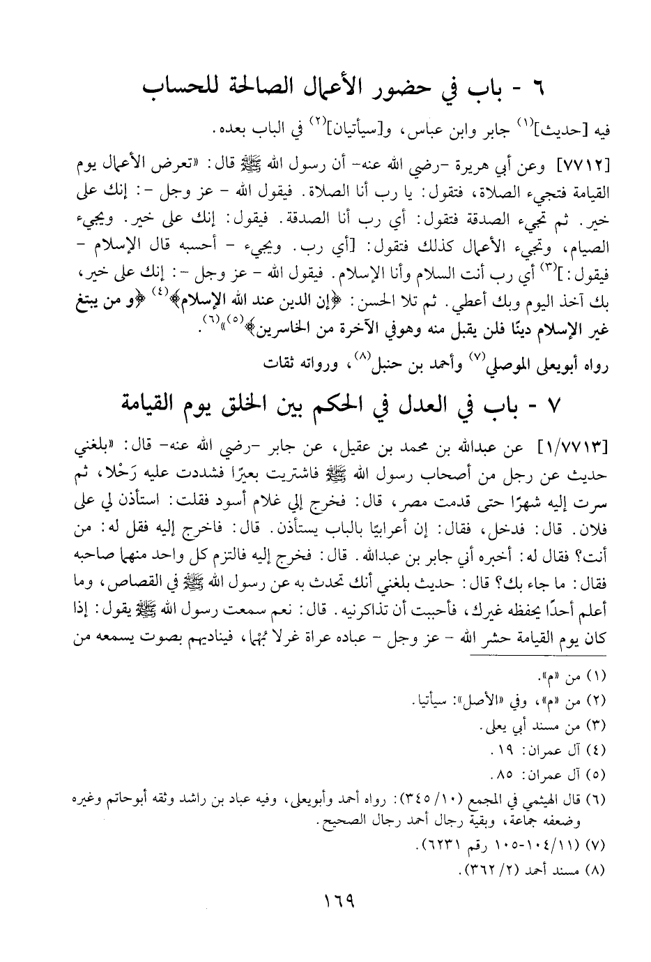 7713 / 1 - عَنْ عَبْدِ اللَّهِ بْنِ مُحَمَّدِ بْنِ عُقَيْلٍ، عَنْ جَابِرٍ- رَضِيَ اللَّهُ عَنْهُ- قَالَ: "بَلَغَنِي حَدِيثٌ عَنْ رَجُلٍ مِنْ أَصْحَابِ رَسُولِ اللَّهِ - صَلَّى اللَّهُ عَلَيْهِ وَسَلَّمَ - فَاشْتَرَيْتُ بَعِيرًا فَشَدَدْتُ عَلَيْهِ رَحْلا، ثُمَّ سِرْتُ إِلَيْهِ شَهْرًا حَتَّى قَدِمْتُ مِصْرَ، قَالَ: فخرج إلي غلام أسود فقلت: استأذن لي على فلان. قالت: فدخل، فقال: إن أعرابيًا بالباب يستأذن. قال: فاخرج إليه فقل له: من أنت؟ فقال له: أخبره أني جابر بن عبد الله. قال: فخرج إليه فالتزم كل واحد منهما صاحبه فقال: ما جاء بك؟ قال: حديث بلغني أنك تُحَدِّثُ بِهِ عَنْ رَسُولِ اللَّهِ - صَلَّى اللَّهُ عَلَيْهِ وَسَلَّمَ - في القصاص، وما أعلم أحدًا يحفظه غيرك، فأحببت أن تذاكرنيه. قَالَ: نَعَمْ سَمِعْتُ رَسُولَ اللَّهِ - صَلَّى اللَّهُ عَلَيْهِ وسلم -يقول: إذا كان يوم القيامة حشر الله- عز وجل- عباده عراة غرلا بُهْما، فيناديهم بصوت يسمعه من