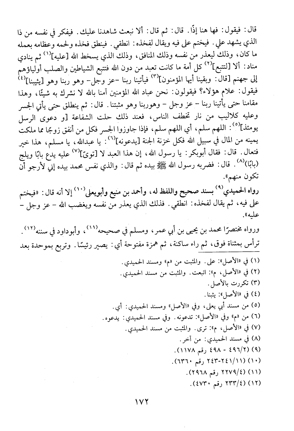 قالت: فَيَقُولُ: فَهَا هُنَا إِذَا. قَالَ: ثُمَّ قَالَ: ألا نبعث شاهدنا عليك. فيفكر في نفسه من ذا الَّذِي يَشْهَدُ عَلَيَّ. فَيُخْتَمُ عَلَى فِيهِ وَيُقَالُ لفخذه: انطقي. فينطق فخذه ولحمه وعظامه بِعَمَلِهِ مَا كَانَ، وَذَلِكَ لِيُعْذَرَ مِنْ نَفْسِهِ وَذَلِكَ الْمُنَافِقُ، وَذَلِكَ الَّذِي يَسْخَطُ اللَّهُ عَلَيْهِ ثُمَّ يُنَادِي مُنَادٍ: أَلَا لِتَتْبَعَ كُلُّ أُمَّةٍ ما كانت تعبد من دون الله فتتبع الشياطين والصلب أولياؤهم إِلَى جَهَنَّمَ قَالَ: وَبَقِينَا أَيُّهَا الْمُؤْمِنُونَ فَيَأْتِيَنَا ربنا- عز وجل- وهو ربنا وهو يثيبنا، فيقولن: علام هؤلاء؟ فيقولون: نحن عباد الله المؤمنين آمَنَّا بِاللَّهِ لَا نُشْرِكُ بِهِ شَيْئًا، وَهَذَا مقامنا حتى يأتينا ربنا- عز وجل- وهو ربنا وهو مثبتنا. قَالَ: ثُمَّ يَنْطَلِقُ حَتَّى يَأْتِيَ الْجِسْرَ وَعَلَيْهِ كَلَالِيبٌ مِنْ نَارٍ تَخْطَفُ النَّاسَ، فَعِنْدَ ذَلِكَ حلت الشفاعة أو دعوى الرسل يومئذ،: اللَّهُمَّ سَلِّمْ، أَيِ اللَّهُمَّ سَلِّمْ، فَإِذَا جَاوَزُوا الْجِسْرَ فَكُلُّ مَنْ أَنْفَقَ زَوْجًا مِمَّا مَلَكَتْ يَمِينُهُ مِنَ الْمَالِ فِي سَبِيلِ اللَّهِ فَكُلُّ خزنة الجنة يدعونه: يَا عَبْدَ اللَّهِ، يَا مُسْلِمَ، هَذَا خَيْرٌ فتعال. قال: فقال أبو بكر: يا رسول الله، إن مذا العبد لا توىً عليه يدع بابًا ويلج (بابًا) قال: فضربه رَسُولُ اللَّهِ - صَلَّى اللَّهُ عَلَيْهِ وَسَلَّمَ - بِيَدِهِ ثُمَّ قَالَ: والذي نفس محمد بِيَدِهِ إِنِّي لَأَرْجُوَ أَنْ تَكُونَ مِنْهُمْ".