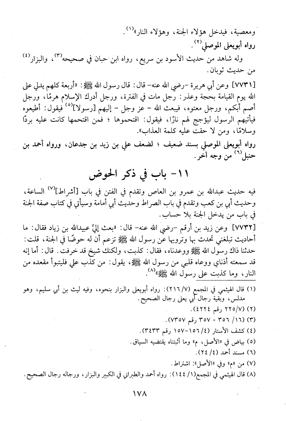 7732 - وَعَنْ زَيْدِ بْنِ أَرْقَمَ- رَضِيَ اللَّهُ عَنْهُ- قَالَ: "بَعَثَ إليَّ عُبَيْدُ اللَّهِ بْنُ زِيَادٍ فَقَالَ: مَا أَحَادِيثَ تَبْلُغُنِي تُحَدِّثُ بِهَا وَتَرْوِيهَا عَنْ رَسُولِ اللَّهِ - صَلَّى اللَّهُ عَلَيْهِ وَسَلَّمَ - تزعم أن له حَوْضًا فِي الْجَنَّةِ، قُلْتُ: حَدَّثَنَا ذَاكَ رَسُولُ اللَّهِ - صَلَّى اللَّهُ عَلَيْهِ وَسَلَّمَ -ووعدناه، فَقَالَ: كَذَبْتَ، وَلَكِنَّكَ شَيْخٌ قَدْ خَرِفْتَ. قَالَ: أَمَا إِنَّهُ قَدْ سَمِعَتْهُ إِذُنَايَ وَوَعَاهُ قَلْبِي مِنْ رَسُولِ اللَّهِ - صَلَّى اللَّهُ عَلَيْهِ وَسَلَّمَ -، يَقُولُ: مَنْ كَذَبَ عَلَيَّ فَلْيَتَبَوَّأُ مِقْعَدَهُ مِنَ النَّارِ، وَمَا كَذَبْتَ عَلَى رَسُولِ اللَّهِ - صَلَّى اللَّهُ عَلَيْهِ وَسَلَّمَ -".