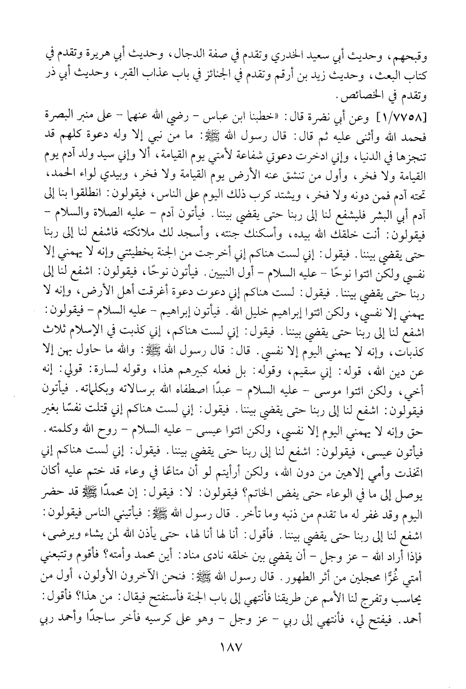7758 / 1 - وعن أبي نضرة قالت: "خطبنا ابْنُ عَبَّاسٍ- رَضِيَ اللَّهُ عَنْهُمَا- عَلَى مِنْبَرِ الْبَصْرَةِ فَحَمَدَ اللَّهَ وَأَثْنَى عَلَيْهِ ثُمَّ قَالَ: قَالَ رَسُولُ اللَّهِ - صَلَّى اللَّهُ عَلَيْهِ وسلم -: مَا مِنْ نَبِيٍّ إِلَّا وَلَهُ دَعْوَةٌ كُلُّهُمْ قد تنجزها فِي الدُّنْيَا، وَإِنِّي ادَّخَرْتُ دَعْوَتِي شَفَاعَةً لِأُمَّتِي يَوْمَ الْقِيَامَةِ، أَلَا وَإِنِّي سَيِّدُ وَلَدِ آدَمَ يَوْمَ الْقِيَامَةِ وَلَا فَخْرَ، وَأَوَّلُ مَنْ تَنْشَقُّ عنه الأرض يوم القيامة ولا فخر، وبيدي لِوَاءُ الْحَمْدِ، تَحْتَهُ آدَمُ فَمَنْ دُونَهُ وَلَا فَخْرٌ، وَيَشْتَدُّ كَرْبُ ذَلِكَ الْيَوْمِ عَلَى النَّاسِ، فيقولون: انطلقوا بنا إلى آدم أبي الشر فيشفع لَنَا إِلَى رَبِّنَا حَتَّى يَقْضِي بَيْنَنَا. فَيَأْتُونَ آدم- عليه الصلاة والسلام- فيقولون: أنت خَلَقَكَ اللَّهُ بِيَدِهِ، وَأَسْكَنَكَ جَنَّتَهُ، وَأَسْجَدَ لَكَ مَلَائِكَتَهُ فَاشْفَعْ لَنَا إِلَى رَبِّنَا حَتَّى يَقْضِيَ بَيْنَنَا. فَيَقُولُ: إِنِّي لَسْتُ هُنَاكُمْ إِنِّي أُخْرِجْتُ من الجنة بخطيئتي وَإِنَّهُ لَا يُهِمُّنِي إِلَّا نَفْسِي وَلَكِنِ ائْتُوا نوحًا- عليه السلام- أَوَّلُ النَّبِيِّينَ. فَيَأْتُونَ نُوحًا، فَيَقُولُونَ: اشْفَعْ لَنَا إِلَى رَبِّنَا حَتَّى يَقْضِيَ بَيْنَنَا. فَيَقُولُ: لَسْتُ هُنَاكُمْ إِنِّي دَعَوْتُ دَعْوَةً أَغْرَقَتْ أَهْلَ الْأَرْضِ، وَإِنَّهُ لَا يُهِمُّنِي إِلَّا نَفْسِي، وَلَكِنِ ائْتُوا إبراهيم خليل الله. فَيَأْتُونَ إِبْرَاهِيمَ- عَلَيْهِ السَّلَامُ- فَيَقُولُونَ: اشْفَعْ لَنَا إِلَى رَبِّنَا حَتَّى يَقْضِيَ بَيْنَنَا. فَيَقُولُ: إِنِّي لَسْتُ هُنَاكُمْ، إِنِّي كَذَبْتُ فِي الْإِسْلَامِ ثَلَاثُ كَذِبَاتٍ، وَإِنَّهُ لَا يُهِمُّنِي الْيَوْمَ إِلَّا نَفْسِي. قَالَ: قَالَ رَسُولُ اللَّهِ - صَلَّى اللَّهُ عَلَيْهِ وَسَلَّمَ -: وَاللَّهِ مَا حَاوَلَ بِهِنَّ إِلَّا عَنْ دِينِ اللَّهِ، قَوْلُهُ: إِنِّي سَقِيمٌ، وَقَوْلُهُ: بَلْ فَعَلَهُ كَبِيرُهُمْ هَذَا، وَقَوْلُهُ لِسَارَةَ: قُولِي: إِنَّهُ أَخِي، وَلَكِنِ ائْتُوا مُوسَى- عَلَيْهِ السَّلَامُ- عَبْدًا اصطفاه الله برسالاته وبكلماته. فيأتون فَيَقُولُونَ: اشْفَعْ لَنَا إِلَى رَبِّنَا حَتَّى يَقْضِيَ بَيْنَنَا. فَيَقُولُ: إِنِّي لَسْتُ هُنَاكُمْ إِنِّي قَتَلْتُ نَفْسًا بِغَيْرِ حَقٍّ وَإِنَّهُ لَا يُهِمُّنِي الْيَوْمَ إِلَّا نَفْسِي، وَلَكِنِ ائْتُوا عِيسَى- عَلَيْهِ السَّلَامُ- رُوحُ اللَّهِ وَكَلِمَتُهُ. فَيَأْتُونَ عِيسَى، فَيَقُولُونَ: اشْفَعْ لَنَا إِلَى رَبِّنَا حَتَّى يَقْضِيَ بَيْنَنَا. فَيَقُولُ: إني لست هناكم إني اتخذت وأمي إلاهين مِنْ دُونِ اللَّهِ، وَلَكِنْ أَرَأَيْتُمْ لَوْ أَنَّ مَتَاعًا فِي وِعَاءٍ قَدْ خُتِمَ عَلَيْهِ أَكَانَ يُوصَلُ إِلَى مَا فِي الْوِعَاءِ حَتَّى يُفَضَّ الْخَاتَمُ؟ فَيَقُولُونَ: لَا: فَيَقُولُ: إِنَّ مُحَمَّدًا - صَلَّى اللَّهُ عَلَيْهِ وَسَلَّمَ - قَدْ حَضَرَ الْيَوْمَ وَقَدْ غُفِرَ لَهُ مَا تَقَدَّمَ مِنْ ذَنْبِهِ وَمَا تَأَخَّرَ. قَالَ رَسُولُ اللَّهِ - صَلَّى اللَّهُ عَلَيْهِ وَسَلَّمَ -: فَيَأْتِينِي النَّاسُ فَيَقُولُونَ: اشْفَعْ لَنَا إِلَى رَبِّنَا حَتَّى يَقْضِيَ بَيْنَنَا. فَأَقُولُ: أَنَا لَهَا أَنَا لَهَا، حَتَّى يَأْذَنَ اللَّهُ لِمَنْ يَشَاءُ وَيَرْضَى، فَإِذَا أَرَادَ اللَّهُ- عَزَّ وَجَلَّ- أَنْ يَقْضِيَ بَيْنَ خَلْقِهِ نَادَى مُنَادٍ: أَيْنَ مُحَمَّدُ وأمته؟ فأقوم وتتبعني أمتي غُرًّا محجلين من أثر الطَّهُورِ. قَالَ رَسُولُ اللَّهِ - صَلَّى اللَّهُ عَلَيْهِ وَسَلَّمَ -: فَنَحْنُ الْآخِرُونَ الْأَوَّلُونَ، أَوَّلُ مَنْ يُحَاسَبُ وتفرج لنا الأمم عن طريقنا فَأَنْتَهِي إِلَى بَابِ الْجَنَّةِ فَأَسْتَفْتِحُ فَيُقَالَ: 