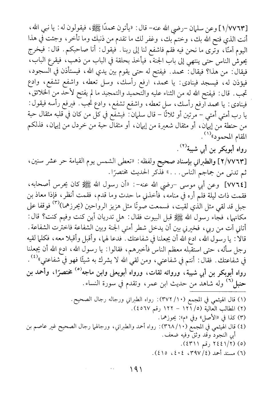 7763 / 1 - وَعَنْ سَلَمَانَ- رَضِيَ اللَّهُ عَنْهُ- قَالَ: "يَأْتُونَ مُحَمَّدًا- صَلَّى اللَّهُ عَلَيْهِ وَسَلَّمَ -، فَيَقُولُونَ لَهُ: يَا نَبِيَّ اللَّهِ، أَنْتَ الَّذِي فَتَحَ اللَّهُ بِكَ، وَخَتَمَ بِكَ، وَغَفَرَ لَكَ مَا تَقَدَّمَ مِنْ ذَنْبِكَ وَمَا تَأَخَّرَ، وَجِئْتَ فِي هَذَا الْيَوْمِ آمِنًا، وَتَرَى مَا نَحْنُ فِيهِ فَقُمْ فَاشْفَعْ لَنَا إِلَى رَبِّنَا. فَيَقُولُ: أَنَا صَاحِبُكُمْ. قَالَ: فَيَخْرُجُ يَحُوشُ النَّاسَ حَتَّى يَنْتَهِيَ إِلَى بَابِ الْجَنَّةِ، فَيَأْخُذُ بِحَلْقَةٍ فِي الْبَابِ مِنْ ذَهَبٍ، فَيَقْرَعُ الْبَابَ، فَيُقَالُ: مَنْ هَذَا؟ فَيُقَالُ: مُحَمَّدٌ. فَيُفْتَحُ لَهُ حَتَّى يَقُومَ بَيْنَ يَدَيِ اللَّهِ، فَيَسْتَأْذِنَ فِي السُّجُودِ، فَيُؤْذَنَ لَهُ، فَيَسْجُدَ فَيُنَادَى: يَا مُحَمَّدُ، ارْفَعْ رَأْسَكَ، وَسَلْ تُعْطَهْ، وَاشْفَعْ تُشَفَّعْ، وَادْعُ تُجَبْ. قَالَ: فَيَفْتَحُ اللَّهُ لَهُ مِنَ الثَّنَاءِ عَلَيْهِ وَالتَّحْمِيدِ وَالتَّمْجِيدِ مَا م يَفْتَحْ لِأَحَدٍ مِنَ الْخَلَائِقِ، فَيُنَادَى: يَا مُحَمَّدُ ارْفَعْ رَأْسَكَ، سَلْ تُعْطَهْ، وَاشْفَعْ تُشَفَّعْ، وَادْعُ تُجَبْ. فَيَرْفَعْ رَأْسَهُ فَيَقُولُ: يَا رَبِّ أُمَّتِي أُمَّتِي- مَرَّتَيْنِ أَوْ ثَلَاثًا- قَالَ سَلْمَانُ: فَيَشْفَعُ فِي كُلِّ مَنْ كَانَ فِي قَلْبِهِ مِثْقَالُ حَبَّةٍ مِنْ حِنْطَةٍ مِنْ إِيمَانٍ، أَوْ مِثْقَالُ شَعِيرَةٍ مِنْ إِيمَانٍ، أَوْ مِثْقَالُ حَبَّةٍ مِنْ خردل من إيمان، فذلكم الْمَقَامُ الْمَحْمُودُ".