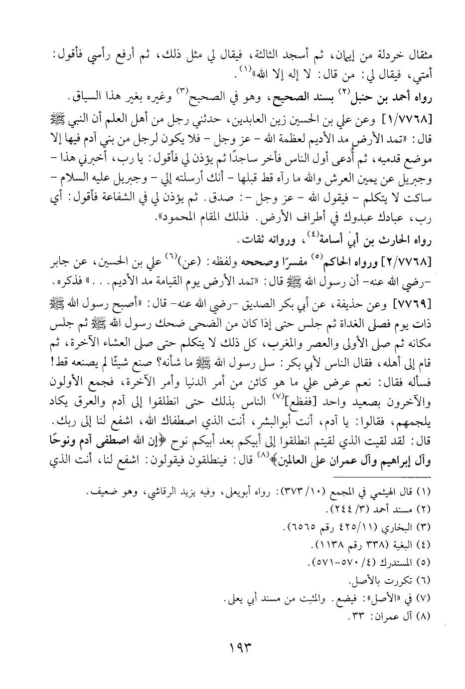 7768 / 1 - وَعَنْ عَلِيِّ بن الحسين زَيْنِ الْعَابِدِينَ، حَدَّثَنِي رَجُلٌ مِنْ أَهْلِ الْعِلْمِ أن النبي - صلى الله عليه وسلم - قال: "تُمَدُّ الْأَرْضُ مَدَّ الْأَدِيمِ لِعَظَمَةِ اللَّهِ- عَزَّ وَجَلَّ- فَلَا يَكُونُ لِرَجُلٍ مِنْ بَنِي آدَمَ فِيهَا إِلَّا مَوْضِعَ قَدَمَيْهِ، ثُمَّ أُدعى أَوَّلَ النَّاسِ فَأَخِرُّ سَاجِدًا ثُمَّ يُؤْذَنُ لِيَ فَأَقُولُ: يَا رَبِّ، أَخْبِرْنِي هَذَا- وَجِبْرِيلُ عَنْ يَمِينِ الْعَرْشِ وَاللَّهُ مَا رَآهُ قَطُّ قَبْلَهَا- إِنَّكَ أَرْسَلْتَهُ إِلَيَّ- وَجِبْرِيلُ عَلَيْهِ السَّلَامُ- سَاكِتٌ لَا يَتَكَلَّمُ- فَيَقُولُ اللَّهُ- عَزَّ وَجَلَّ-: صَدَقَ. ثُمَّ يُؤْذَنُ لِيَ فِي الشَّفَاعَةِ فَأَقُولُ: أَيْ رَبِّ، عِبَادُكَ عَبَدُوكَ فِي أَطْرَافِ الْأَرْضِ. فَذَلِكَ الْمَقَامُ الْمَحْمُودُ".