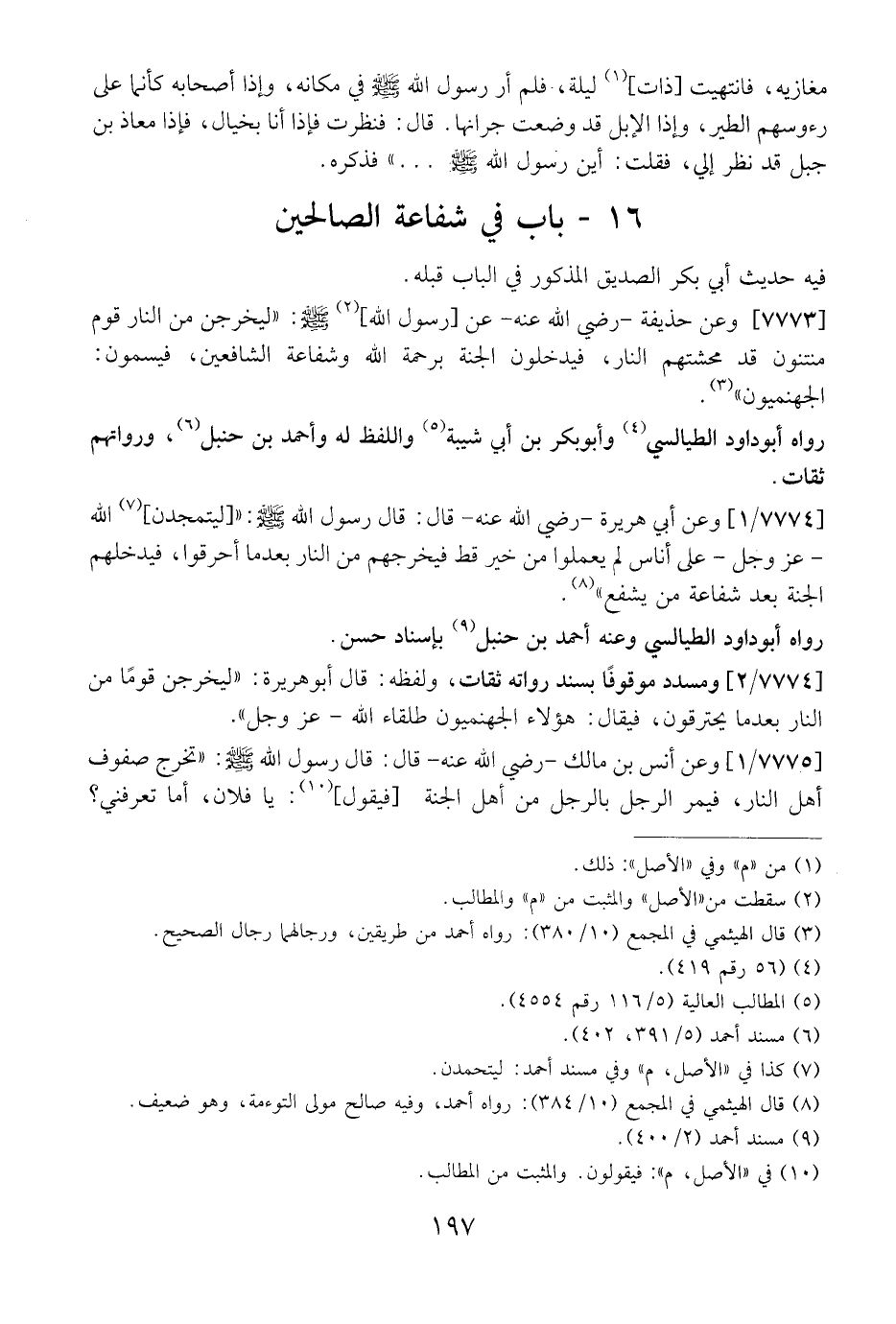 7773 - وَعَنْ حُذَيْفَةَ- رَضِيَ اللَّهُ عَنْهُ- عَنْ رَسُولِ اللَّهِ - صَلَّى اللَّهُ عَلَيْهِ وَسَلَّمَ -: لَيَخْرُجَنَّ مِنَ النَّارِ قَوْمٌ مُنْتِنُونَ قَدْ مَحَشَتْهُمُ النَّارُ، فَيَدْخُلُونَ الْجَنَّةَ بِرَحْمَةِ اللَّهِ وَشَفَاعَةِ الشَّافِعِينَ، فَيُسَمُّونَ: الْجَهَنَّمِيُّونَ".