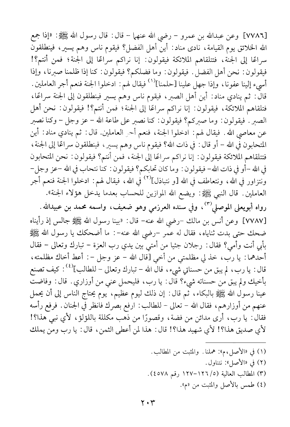7786 - وَعَنْ عَبْدِ اللَّهِ بْنِ عَمْرٍو- رَضِيَ اللَّهُ عَنْهُمَا- قَالَ: قَالَ رَسُولُ اللَّهِ - صَلَّى اللَّهُ عَلَيْهِ وَسَلَّمَ -: "إِذَا جَمَعَ اللَّهُ الْخَلَائِقَ يَوْمَ الْقِيَامَةِ، نَادَى مُنَادٍ: أَيْنَ أَهْلُ الْفَضْلِ؟ فَيَقُومُ نَاسٌ وَهُمْ يَسِيرٌ، فَيَنْطَلِقُونَ سِرَاعًا إِلَى الْجَنَّةِ، فَتَتَلَقَّاهُمُ الْمَلَائِكَةُ فَيَقُولُونَ: إِنَّا نَرَاكُمْ سِرَاعًا إِلَى الْجَنَّةِ، فَمَنْ أَنْتُمْ؟! فَيَقُولُونَ: نَحْنُ أَهْلُ الْفَضْلِ. فَيَقُولُونَ: وَمَا فَضْلُكُمْ؟ فَيَقُولُونَ: كُنَّا إِذَا ظُلِمْنَا صبرنا، واذا أسيء إِلَيْنَا عَفَوْنَا، وَإِذَا جُهِلَ عَلَيْنَا حَلُمْنَا فَيقَالَ لَهُمُ: ادْخُلُوا الْجَنَّةَ فَنِعْمَ أَجْرُ الْعَامِلِينَ. قَالَ: ثُمَّ يُنَادِي مُنَادٍ: أَيْنَ أَهْلُ الصَّبْرِ، فَيَقُومُ نَاسٌ وَهُمْ يَسِيرٌ فَيَنْطَلِقُونَ إِلَى الْجَنَّةِ سِرَاعًا، فتلقاهم الْمَلَائِكَةُ، فَيَقُولُونَ: إِنَّا نَرَاكُمْ سِرَاعًا إِلَى الْجَنَّةِ؟ فَمَنْ أَنْتُمْ؟! فَيَقُولُونَ: نَحْنُ أَهْلُ الصَّبْرِ. فَيَقُولُونَ: وَمَا صَبْرُكُمْ؟ فَيَقُولُونَ: كُنَّا نَصْبِرُ عَلَى طَاعَةِ اللَّهِ- عَزَّ وَجَلّ- وَكُنَّا نَصْبِرُ عَنْ مَعَاصِي اللَّهِ. فَيُقَالُ لَهُمُ: ادْخُلُوا الْجَنَّةَ، فَنِعْمَ أَجْرُ الْعَامِلِينَ. قَالَ: ثُمَّ يُنَادِي مُنَادٍ: أَيْنَ الْمُتَحَابُونَ فِي اللَّهِ- أَوْ قَالَ: فِي ذَاتِ اللَّهِ؟ فَيَقُومُ نَاسٌ وَهُمْ يَسِيرٌ، فَيَنْطَلِقُونَ سِرَاعًا إِلَى الْجَنَّةِ، فَتَتَلَقَّاهُمُ الْمَلَائِكَةُ فَيَقُولُونَ: إِنَّا نَرَاكُمْ سِرَاعًا إلى الجنة، فمن أنتم؟ فيقولون: نحن المتحابون في الله- أو في ذات الله- فيقولون: وما كان تحابكم؟ فَيَقُولُونَ: كُنَّا نَتَحَابُّ فِي اللَّهِ- عَزَّ وَجَلَّ- ونتزاور في الله، ونتعاطف في الله أو نتباذل في اللَّهِ، فَيُقَالُ لَهُمُ: ادْخُلُوا الْجَنَّةَ فَنِعْمَ أَجْرُ الْعَامِلِينَ. قَالَ النَّبِيُّ - صَلَّى اللَّهُ عَلَيْهِ وَسَلَّمَ -: وَيَضَعُ اللَّهُ الْمَوَازِينَ لِلْحِسَابِ بَعْدَمَا يَدْخُلُ هَؤُلَاءِ الْجَنَّةَ".