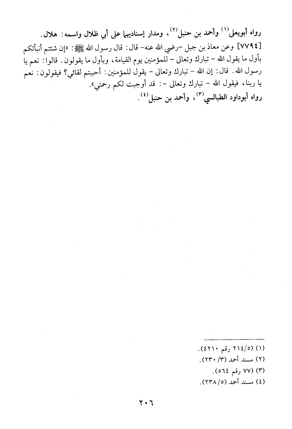 7794 - وَعَنْ مُعَاذِ بْنِ جَبَلٍ- رَضِيَ اللَّهُ عَنْهُ- قَالَ: قَالَ رَسُولُ اللَّهِ - صَلَّى اللَّهُ عَلَيْهِ وسلم -: "إِنْ شِئْتُمْ أَنْبَأْتُكُمْ بِأَوَّلِ مَا يَقُولُ اللَّهُ- تَبَارَكَ وَتَعَالَى- لِلْمُؤْمِنِينَ يَوْمَ الْقِيَامَةِ، وَبِأَوَّلِ مَا يَقُولُونَ. قَالُوا: نَعَمْ يَا رَسُولَ اللَّهِ. قَالَ: إن الله- تبارك وتعالى- يقول للمؤمنين: أَحْبَبْتُمْ لِقَائِيَ؟ فَيَقُولُونَ: نَعَمْ يَا رَبَّنَا، فَيَقُولُ اللَّهُ- تَبَارَكَ وَتَعَالَى-: قَدْ أُوجِبَتْ لَكُمْ رَحْمَتِي".