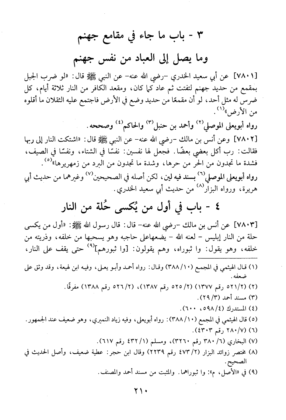7803 - عَنْ أَنَسِ بْنِ مَالِكٍ- رَضِيَ اللَّهُ عَنْهُ- قَالَ: قَالَ رَسُولُ اللَّهِ - صَلَّى اللَّهُ عَلَيْهِ وَسَلَّمَ -: "أَوَّلُ مَنْ يُكْسَى حُلَّةً مِنَ النَّارِ إِبْلِيسُ- لَعَنَةُ اللَّهُ- يَضَعُهَا عَلَى حَاجِبِهِ وَهُوَ يَسْحَبُهَا مِنْ خلفه، وذريته من خلفه، وهو يقوله: واثبوراه، وهم يقولون: وا ثبورهم حَتَّى يَقِفَ عَلَى النَّارِ،