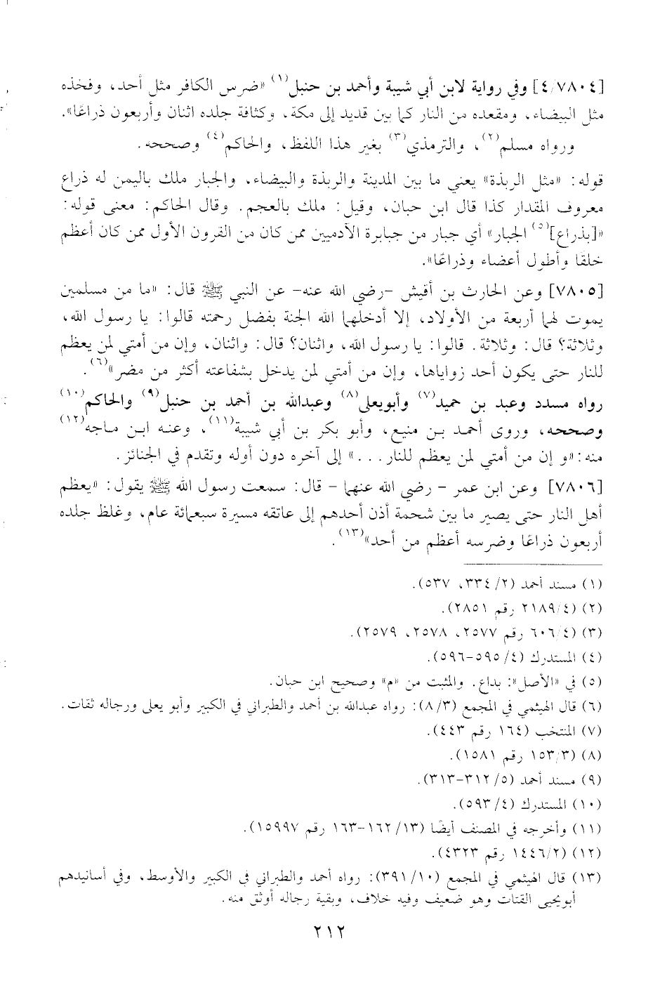 7804 / 4 - وفي رواية لابن أبي شيبة وأحمد بن حنبل "ضرس الكافر مثل أُحد، وفخذه مثل البيضاء، ومقعده من النار كما بين قديد إلى مكة، وكثافة جلده اثنان وأربعون ذراعًا".