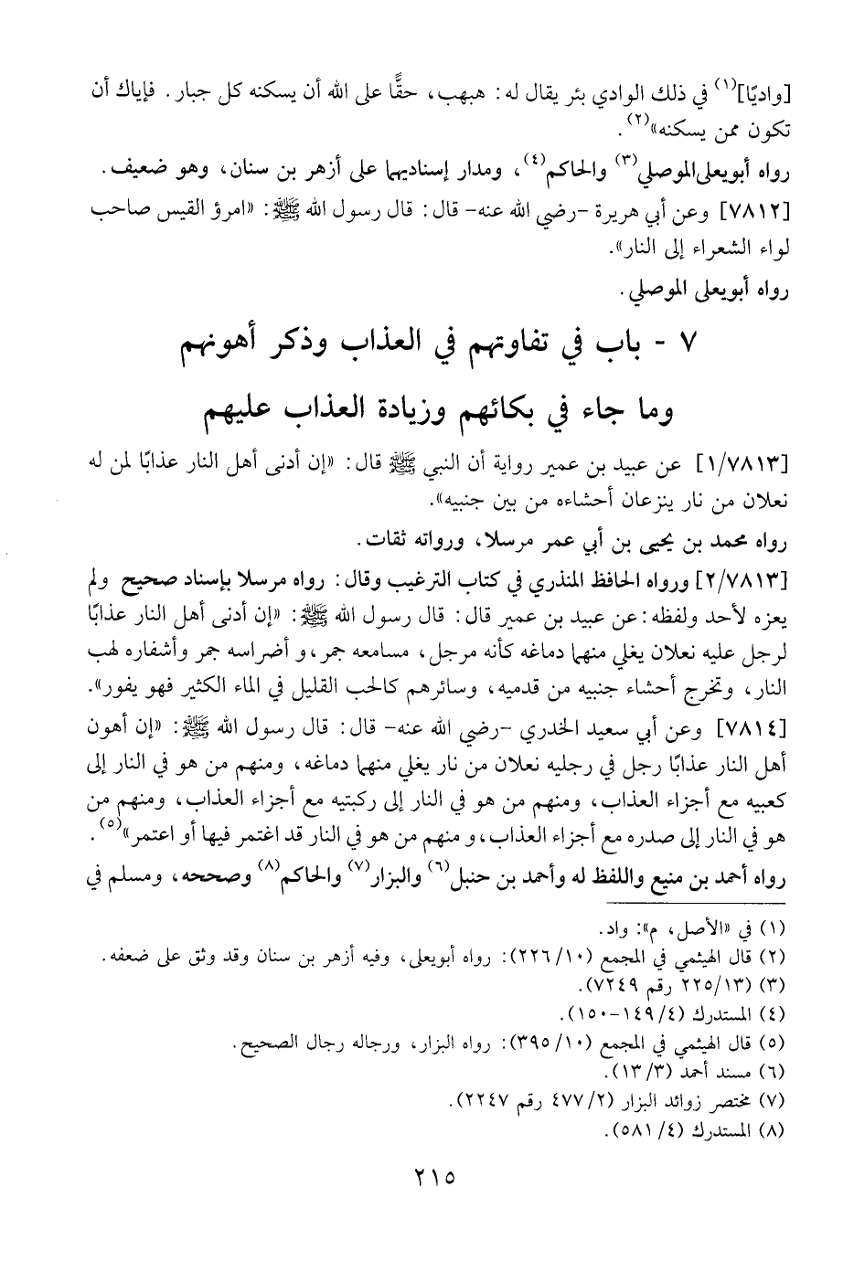 7- بَابٌ فِي تَفَاوُتِهِمْ فِي الْعَذَابِ وَذِكِْر أَهْوَنِهِمْ وَمَا جَاءَ فِي بُكَائِهِمْ وَزِيَادَةِ الْعَذَابِ عَلَيْهِمْ