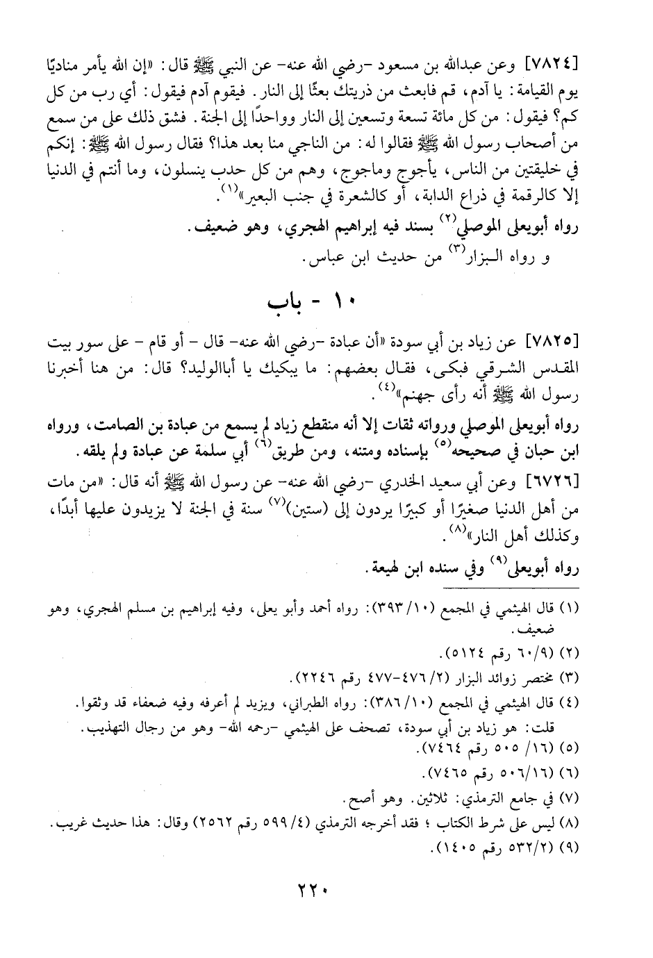 7824 - وَعَنْ عَبْدِ اللَّهِ بْنِ مَسْعُودٍ- رَضِيَ اللَّهُ عَنْهُ- عَنِ النَّبِيِّ - صَلَّى اللَّهُ عَلَيْهِ وَسَلَّمَ -قَالَ: "إن الله يأمر مناديًا يوم القيامة: يا آدم، قم فابعث من ذريتك بعثًا إلى النار. فيقوم آدم فيقول: أي رب من كل كم؟ فيقول: من كل مائة تسعة وتسعين إلى النار وواحدًا إلى الجنة. فشق ذلك على من سمع مِنْ أَصْحَابِ رَسُولِ اللَّهِ - صَلَّى اللَّهُ عَلَيْهِ وسلم - فقالوا له: من الناجي منا بعد هذا؟ فقال رسول الله: إنكم في خليقتين من الناس، يأجوج ومأجوج، وهم من كل حدب ينسلون، وما أنتم في الدنيا إلا كالرقمة في ذراع الدابة، أو كالشعرة في جنب البعير".