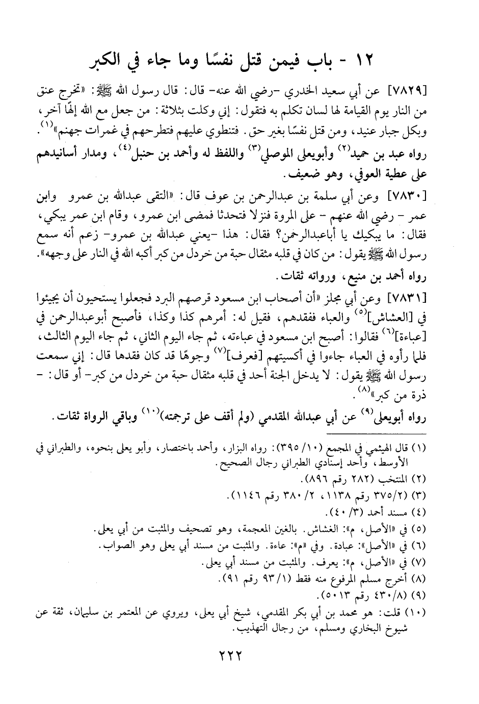 7830 - وَعَنْ أَبِي سَلَمَةَ بْنِ عَبْدِ الرَّحْمَنِ بْنِ عَوْفٍ قَالَ: "الْتَقَى عبد الله بن عمرو وابن عمر- رَضِيَ اللَّهُ عَنْهُمْ- عَلَى الْمَرْوَةِ فَنَزَلا فَتَحَدَّثَا فَمَضَى ابْنُ عَمْرٍو، وَقَامَ ابْنُ عُمَرَ يَبْكِي، فقال: ما يبكيك يا أباعبد الرَّحْمَنِ؟ فَقَالَ: هَذَا- يَعْنِي عَبْدَ اللَّهَ بْنَ عَمْرٍو- زَعَمَ أَنَّهُ سَمِعَ رَسُولَ اللَّهِ - صَلَّى اللَّهُ عَلَيْهِ وَسَلَّمَ - يَقُولُ: مَنْ كَانَ فِي قلبه مثقال حبة من خردل من كبر أَكَبَّهُ اللَّهُ فِي النَّارِ عَلَى وَجْهِهِ".