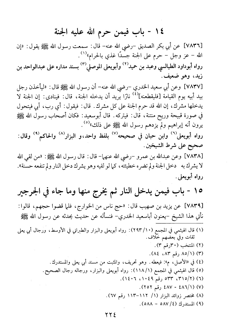 7836 - عَنْ أَبِي بَكْرٍ الصِّدِّيقِ- رَضِيَ اللَّهُ عَنْهُ- قَالَ: سَمِعْتُ رَسُولَ اللَّهِ - صَلَّى اللَّهُ عَلَيْهِ وَسَلَّمَ -يَقُولُ: "إِنَّ اللَّهَ- عز وجل- حرم على الجنة جسدًا غذي بالحرام".