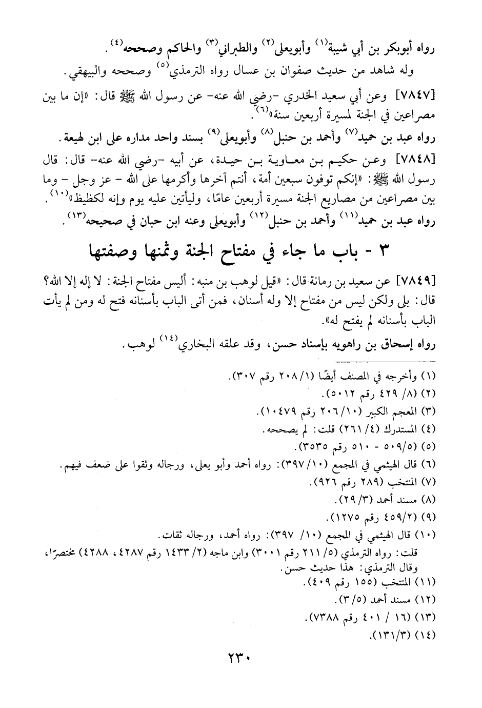 7849 - عن سعيد بن رمانة قال: "قيل لوهب بن منبه: أليس مفتاح الجنة: لا إله إلا الله؟ قالت: بلى ولكن ليس من مفتاح إلا وله أسنان، فمن أتى الباب بأسنانه فُتح له ومن! يأت الباب بأسنانه لم يفتح له".