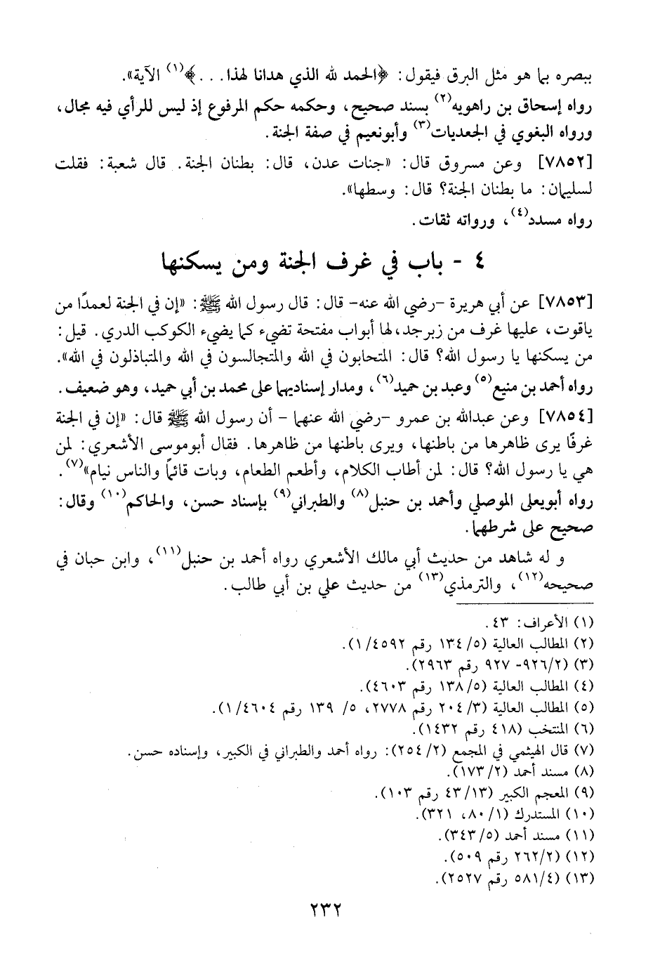رواه إسحاق بن راهويه بسند صحيح، وَحُكْمُهُ حُكْمُ الْمَرْفُوعِ إِذْ لَيْسَ لِلرَّأْيِ فِيهِ مَجَالٌ، وَرَوَاهُ الْبَغَوِيُّ فِي الْجُعْدِيَّاتِ وَأَبُو نُعَيْمٍ فِي صِفَةِ الْجَنَّةِ.