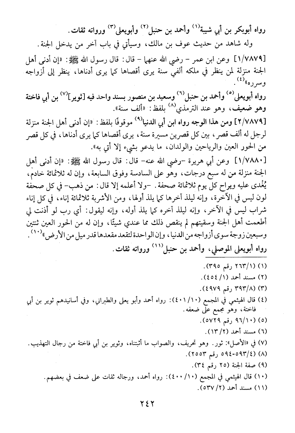 7879 / 2 - ومن هذا الوجه رواه ابن أبي الدُّنيا موقوفًا بلفظ: "إن أدنى أهل الجنة منزلة لرجل له ألف قصر، بين كل قصرين مسيرة سنة، يرىَ أقصاها كما يرى أدناها، في كل قصر من الحور العين والرياحين والولدان، ما يدعو بشيء إلا أتي به".
