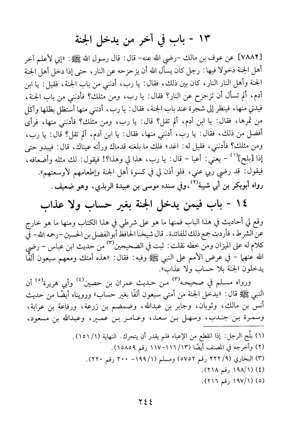 وَرَوَاهُ مُسْلِمٌ فِي صَحِيحِهِ مِنْ حَدِيثِ عِمْرَانَ بن حصين وأبي هُرَيْرَةَ أَنّ النَّبِيَّ - صَلَّى اللَّهُ عَلَيْهِ وَسَلَّمَ - قَالَ: يَدْخُلُ الْجَنَّةَ مِنْ أُمَّتِي سَبْعُونَ أَلْفًا بِغَيْرِ حِسَابٍ" وَرُوِينَاهُ أَيْضًا مِنْ حَدِيثِ أَنَسِ بْنِ مَالِكٍ، وَثَوْبَانَ، وَجَابِرِ بْنِ عَبْدِ اللَّهِ، وَضَمْضَمِ بْنِ زُرْعَةَ، وَرِفَاعَةِ بْنِ عَرَابَةٍ، وَسَمُرَةَ بْنِ جُنْدُبٍ، وَسَهْلُ بْنُ سَعْدٍ، وَعَامِرِ بْنِ عُمَيْرٍ، وَعَبْدِ اللَّهِ بْنِ مَسْعُودٍ