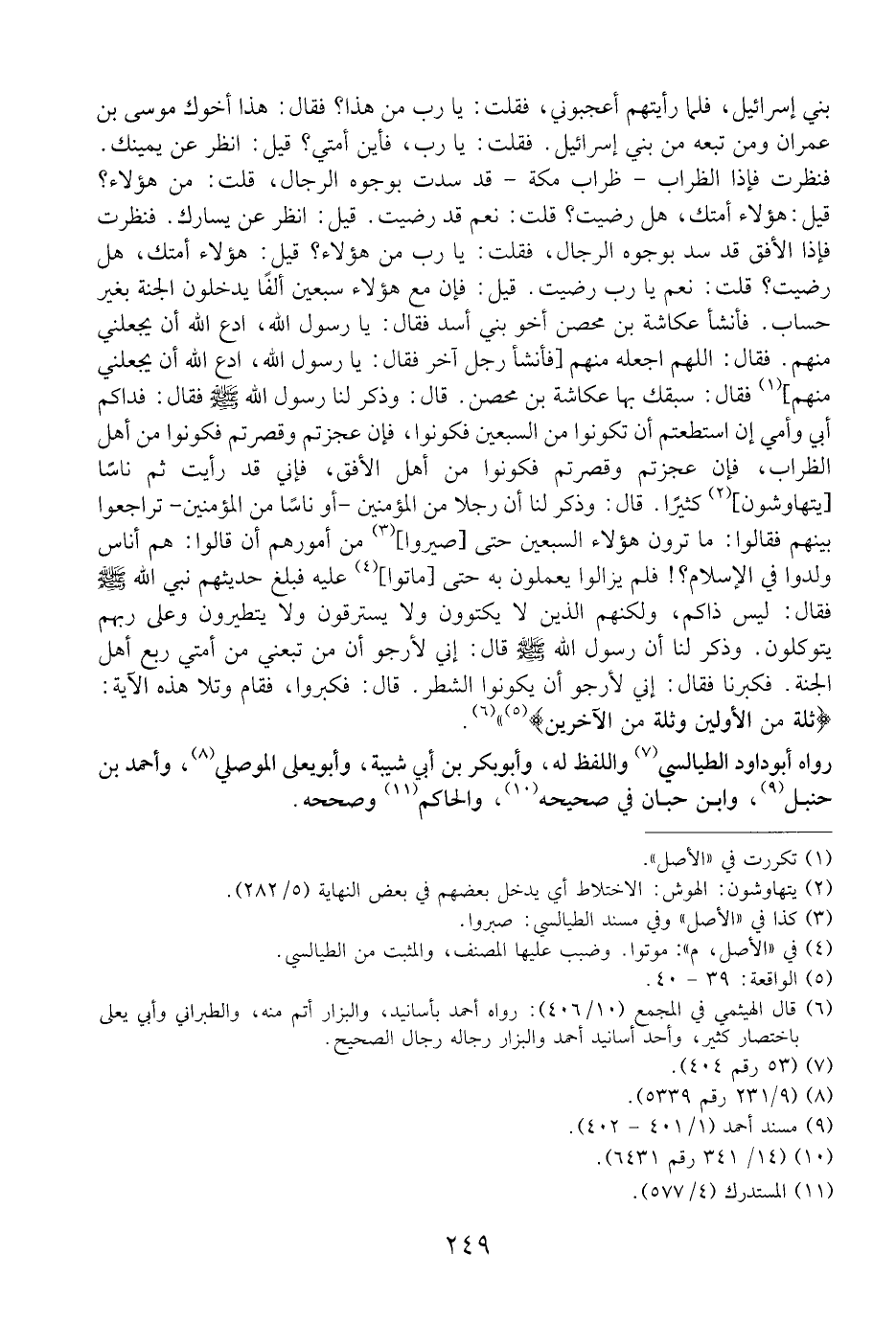 بَنِي إِسْرَائِيلَ، فَلَمَّا رَأَيْتُهُمْ أَعْجَبُونِيَ، فَقُلْتُ: يَا رَبِّ مَنْ هَذَا؟ فَقَالَ: هَذَا أَخُوكَ مُوسَى بْنُ عِمْرَانَ وَمَنْ تَبِعَهُ مِنْ بَنِي إِسْرَائِيلَ. فَقُلْتُ: يَا رَبِّ، فَأَيْنَ أُمَّتِي؟ قِيلَ: انْظُرْ عن يمينك. فنظرت فإذا الظراب- ظراب مَكَّةَ- قَدْ سُدَّتْ بِوُجُوهِ الرِّجَالِ، قُلْتُ: مَنْ هَؤُلَاءِ؟ قِيلَ: هَؤُلَاءِ أُمَّتُكَ، هَلْ رَضِيتَ؟ قُلْتُ: نَعَمْ قَدْ رَضِيتُ. قِيلَ: انْظُرْ عَنْ يَسَارِكَ. فَنَظَرْتُ فَإِذَا الْأُفُقُ قَدْ سُدَّ بِوُجُوهِ الرِّجَالِ، فَقُلْتُ: يَا رَبِّ مَنْ هَؤُلَاءِ؟ قِيلَ: هَؤُلَاءِ أمتك، هل رضيت؟ قُلْتُ: نَعَمْ يَا رَبِّ رَضِيتُ. قِيلَ: فَإِنَّ مَعَ هَؤُلَاءِ سَبْعِينَ أَلْفًا يَدْخُلُونَ الْجَنَّةَ بِغَيْرِ حِسَابٍ. فَأَنْشَأَ عُكَّاشَةُ بْنُ مِحْصَنَ أَخُو بَنِي أَسَدٍ فَقَالَ: يَا رَسُولَ اللَّهِ، ادْعُ اللَّهَ أَنْ يَجْعَلَنِي مِنْهُمْ. فَقَالَ: اللَّهُمَّ اجْعَلْهُ مِنْهُمْ فَأَنْشَأَ رَجُلٌ آخَرُ فَقَالَ: يَا رَسُولَ اللَّهِ، ادْعُ اللَّهَ أَنْ يَجْعَلَنِي مِنْهُمْ، فَقَالَ: سَبَقَكَ بِهَا عُكَّاشَةُ بْنُ مِحْصَنْ. قَالَ: وَذَكَرَ لَنَا رَسُولُ اللَّهِ - صَلَّى اللَّهُ عَلَيْهِ وَسَلَّمَ -فقال: فِدَاكُمْ أَبِي وَأُمِّي إِنِ اسْتَطَعْتُمْ أَنْ تَكُونُوا مِنَ السَّبْعِينَ فَكُونُوا، فَإِنْ عَجَزْتُمْ وَقَصَّرْتُمْ فَكُونُوا من أهل الظراب، فَإِنْ عَجَزْتُمْ وَقَصَّرْتُمْ فَكُونُوا مِنْ أَهْلِ الْأُفُقِ، فإني قد رأيت ثم ناسا يتهاوشون كَثِيرًا. قَالَ: وَذَكَرَ لَنَا أَنَّ رَجُلًا مِنَ المؤمنين- أو نالسًا مِنَ الْمُؤْمِنِينَ- تَرَاجَعُوا بَيْنَهُمْ فَقَالُوا: مَا تَرَونَ هَؤُلَاءِ السَّبْعِينَ حَتَّى صَيَّرُوا مِنْ أُمُورِهِمْ أَنْ قَالُوا: هُمْ أُنَاسٌ وُلِدُوا فِي الْإِسْلَامِ؟! فَلَمْ يزالوا يعملون به حتى ماتوا عَلَيْهِ فَبَلَغَ حَدِيثُهُمْ نَبِيِّ اللَّهِ - صَلَّى اللَّهُ عَلَيْهِ وَسَلَّمَ - فَقَالَ: لَيْسَ ذَاكُمْ، وَلَكِنَّهُمُ الَّذِينَ لَا يَكْتَوُونَ وَلَا يَسْتَرْقُونَ وَلَا يَتَطَيَّرُونَ وَعَلَى رَبِّهِمْ يَتَوَكَّلُونَ. وَذُكِرَ لَنَا أَنَّ رَسُولَ اللَّهِ - صَلَّى اللَّهُ عَلَيْهِ وَسَلَّمَ - قَالَ: إِنِّي لَأَرْجُوَ أَنَّ مَنْ تَبِعَنِي مِنْ أُمَّتِي رُبُعَ أَهْلِ الْجَنَّةِ. فَكَبَّرْنَا فَقَالَ: إِنِّي لَأَرْجُو أَنْ يَكُونُوا الشَّطْرَ. قَالَ: فَكَبَّرُوا، فَقَامَ وَتَلَا هَذِهِ الْآيَةَ: {ثلة من الأولين وثلة من الآخرين} ".
