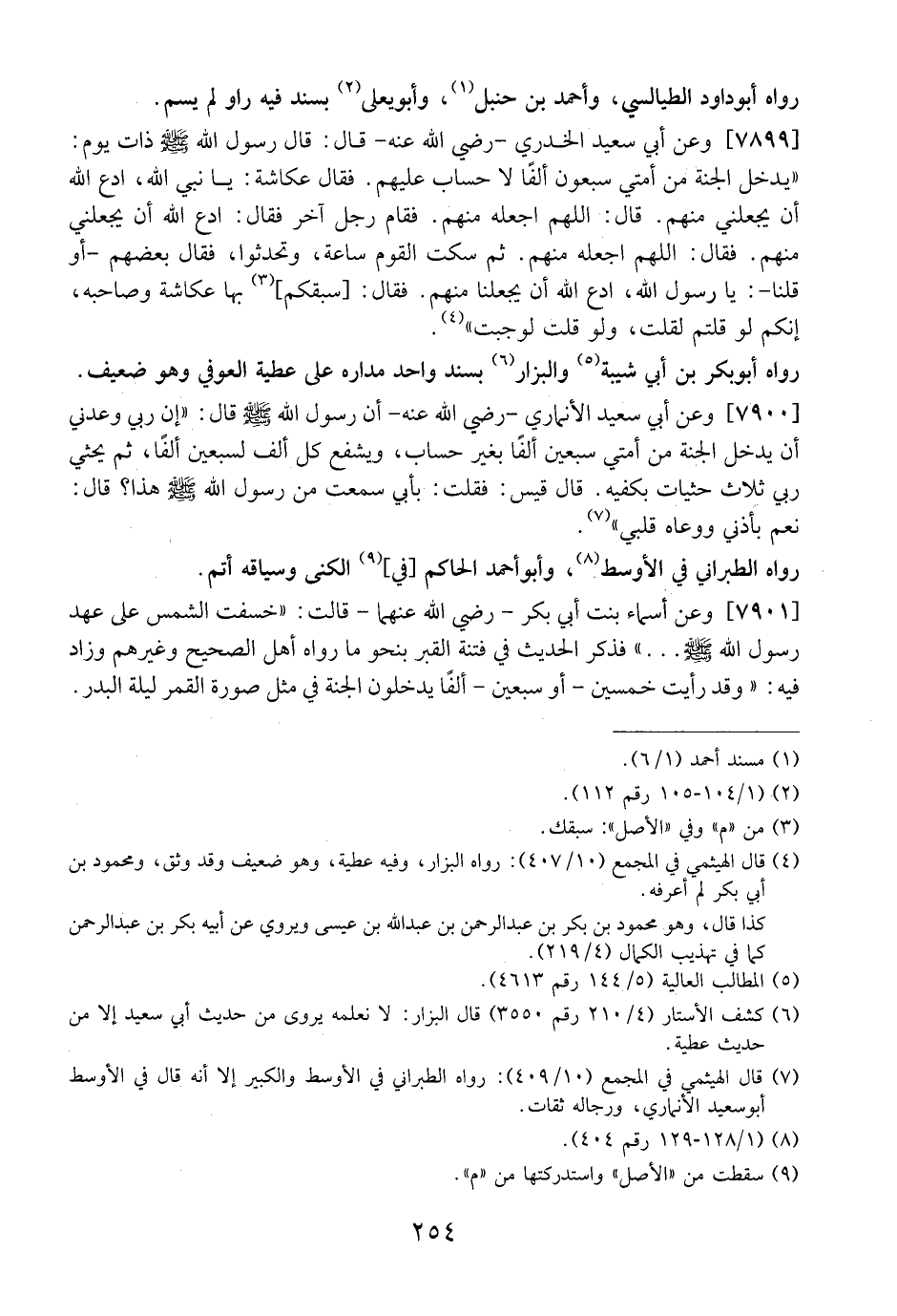 7899 - وَعَنْ أَبِي سَعِيدٍ الْخُدْرِيِّ- رَضِيَ اللَّهُ عَنْهُ- قَالَ: قَالَ رَسُولُ اللَّهِ - صَلَّى اللَّهُ عَلَيْهِ وَسَلَّمَ -ذَاتَ يَوْمٍ: "يَدْخُلُ الْجَنَّةَ مِنْ أُمَّتِي سَبْعُونَ أَلْفًا لَا حِسَابَ عَلَيْهِمْ. فَقَالَ عُكَّاشَةُ: يَا نَبِيَّ اللَّهِ، ادْعُ اللَّهَ أَنْ يَجْعَلَنِي مِنْهُمْ. قَالَ: اللَّهُمَّ اجْعَلْهُ مِنْهُمْ. فَقَامَ رَجُلٌ آخَرُ فَقَالَ: ادْعُ اللَّهَ أَنْ يَجْعَلَنِي مِنْهُمْ. فَقَالَ: اللَّهُمَّ اجْعَلْهُ مِنْهُمْ. ثُمَّ سَكَتَ الْقَوْمُ سَاعَةً، وَتَحَدَّثُوا، فَقَالَ بَعْضُهُمْ- أَوَ قُلْنَا-: يَا رسول الله، ادع الله أن يجعلنا منهم. فقال: سبقكم بِهَا عُكَّاشَةُ وَصَاحِبُهُ، إِنَّكُمْ لَوْ قُلْتُمْ لَقُلْتُ، وَلَوْ قُلْتُ لَوَجَبَتْ".