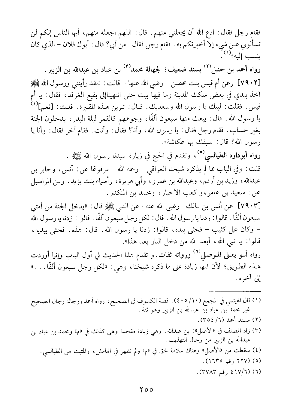 7903 - عَنْ أَنَسِ بْنِ مَالِكٍ- رَضِيَ اللَّهُ عَنْهُ- عَنِ النَّبِيِّ - صَلَّى اللَّهُ عَلَيْهِ وَسَلَّمَ -قَالَ: "يَدْخُلُ الْجَنَّةَ مِنْ أُمَّتِي سَبْعُونَ أَلْفًا. قَالُوا: زِدْنَا يَا رَسُولَ اللَّهِ. قَالَ: لكل رجل سَبْعُونَ أَلْفًا. قَالُوا: زِدْنَا يَا رَسُولَ اللَّهِ - وَكَانَ عَلَى كَثِيبٍ- فَحَثَى بِيَدِهِ، قَالُوا: زِدْنَا يَا رَسُولَ اللَّهِ. قَالَ: هَذِهِ. فَحَثَى بِيَدَيْهِ، قَالُوا: يَا نَبِيَّ اللَّهِ، أَبْعَدَ اللَّهُ مَنْ دَخَلَ النَّارَ بَعْدَ هَذَا".
