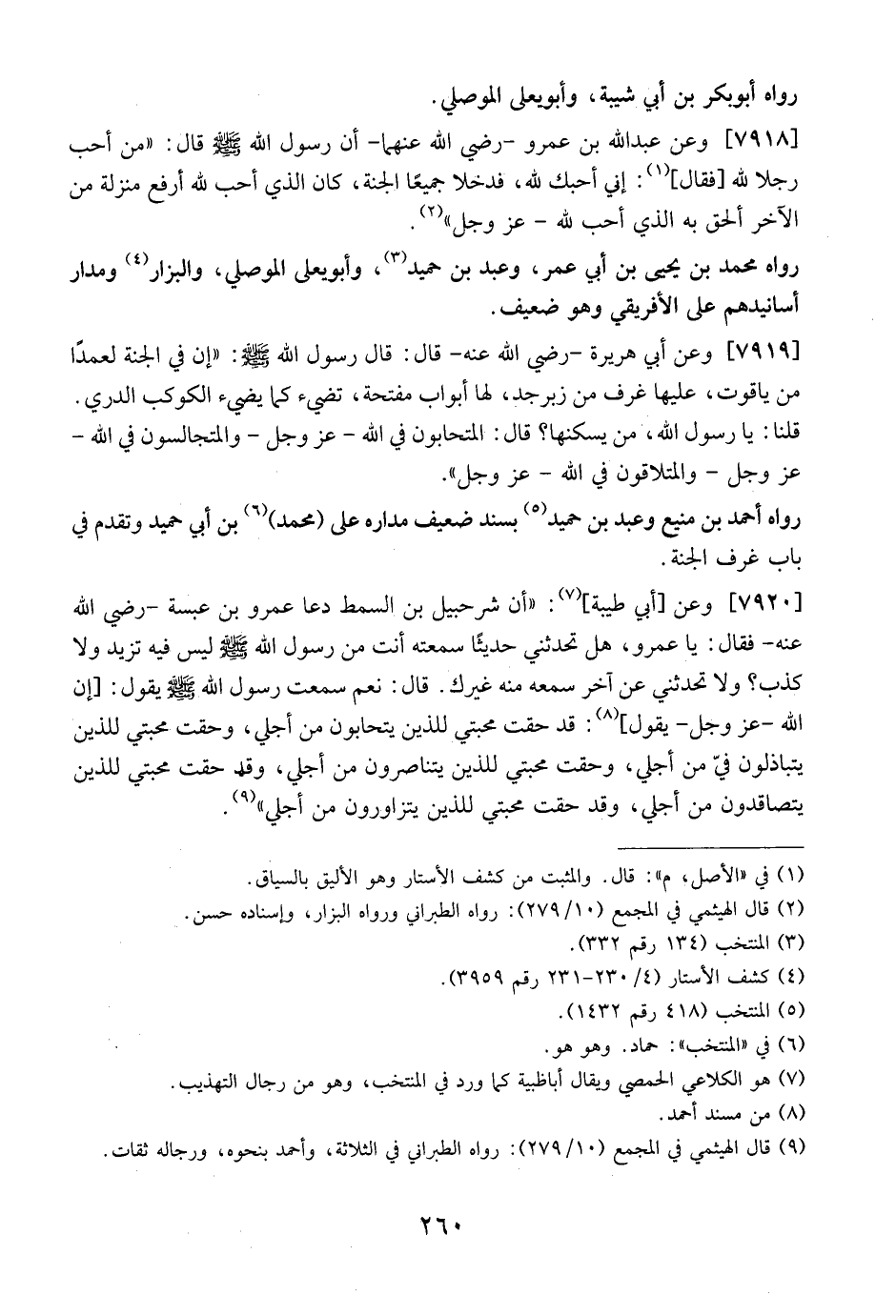 7920 - وَعَنْ أَبِي طَيْبَةَ: "أَنَّ شُرَحْبِيلَ بْنَ السِّمْطِ دَعَا عَمْرَو بْنَ عَبْسَةَ- رَضِيَ اللَّهُ عَنْهُ- فَقَالَ: يَا عَمْرُو، هَلْ تُحَدِثَنِي حَدِيثًا سَمِعْتَهُ أَنْتَ مِنْ رَسُولِ اللَّهِ - صَلَّى اللَّهُ عَلَيْهِ وَسَلَّمَ -لَيْسَ فِيهِ تَزَيُّدٌ وَلَا كَذِبٌ؟ وَلَا تُحَدِّثَنِي عَنْ آخَرَ سَمِعَهُ مِنْهُ غَيْرِكَ. قَالَ: نَعَمْ سَمِعْتُ رَسُولَ اللَّهِ - صَلَّى اللَّهُ عَلَيْهِ وَسَلَّمَ - يَقُولُ: إِنَّ اللَّهَ- عَزَّ وَجَلَّ- يَقُولُ: قَدْ حَقَّتْ مَحَبَّتِي لِلَّذِينَ يَتَحَابُّونَ مِنْ أَجْلِي، وَحَقَّتْ مَحَبَّتِي لِلَّذِينَ يَتَبَاذَلُونَ فِيَ مِنْ أَجْلِي، وَحَقَّتْ مَحَبَّتِيَ لِلَّذِينَ يَتَنَاصَرُونَ مِنْ أَجْلِي، وقلى حقت محبتي للذين يتصاقدون مِنْ أَجْلِي، وَقَدْ حَقَّتْ مَحَبَّتِي لِلَّذِينَ يَتَزَاوَرُونَ من أجلي".