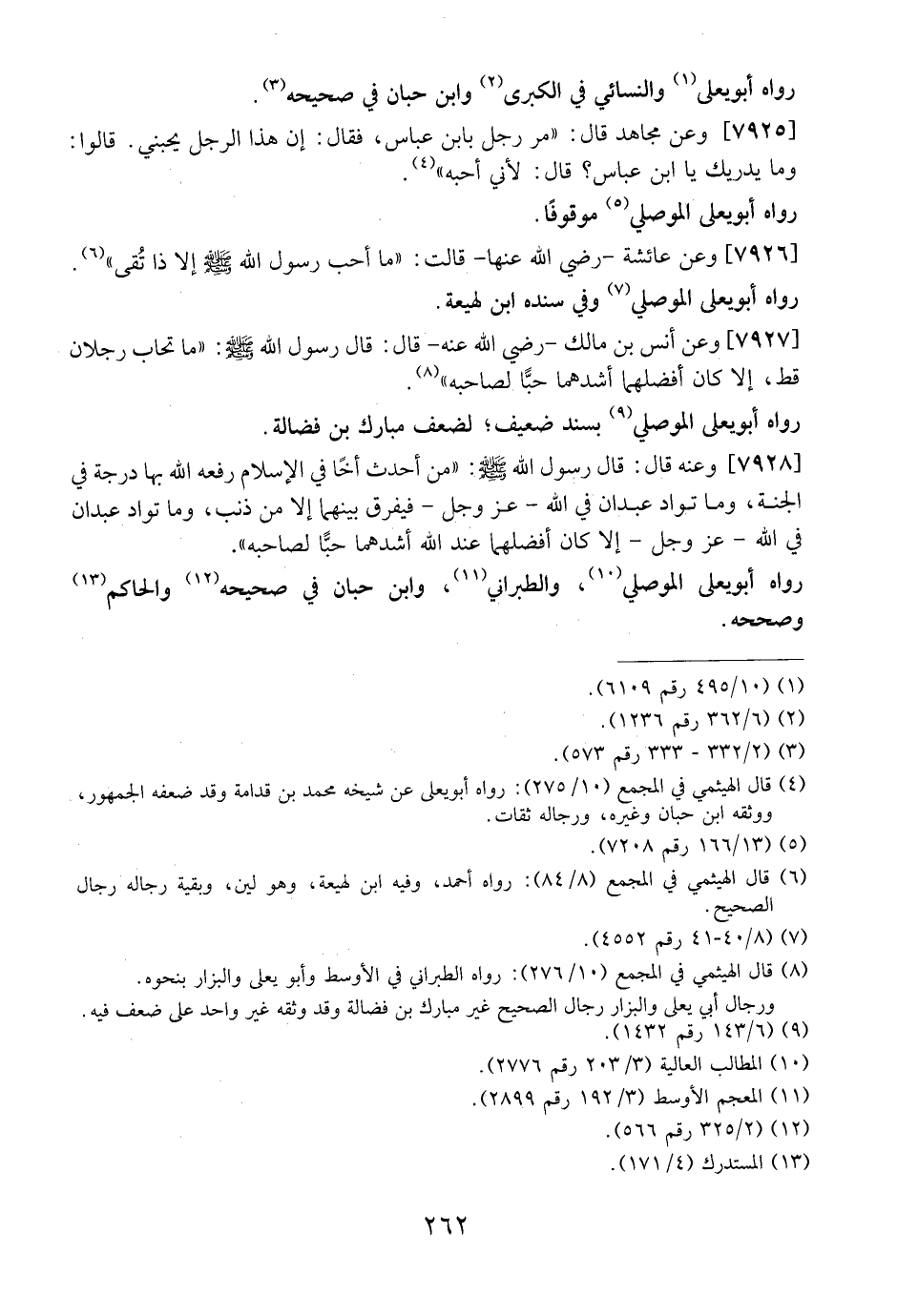 7925 - وَعَنْ مُجَاهِدٍ قَالَ: "مَرَّ رَجُلٌ بِابْنِ عَبَّاسٍ، فَقَالَ: إِنَّ هَذَا الرَّجُلَ يُحِبُّنِي. قَالُوا: وَمَا يُدْرِيكَ يَا ابْنَ عَبَّاسٍ؟ قَالَ: لِأَنِّي أُحِبُّهُ".