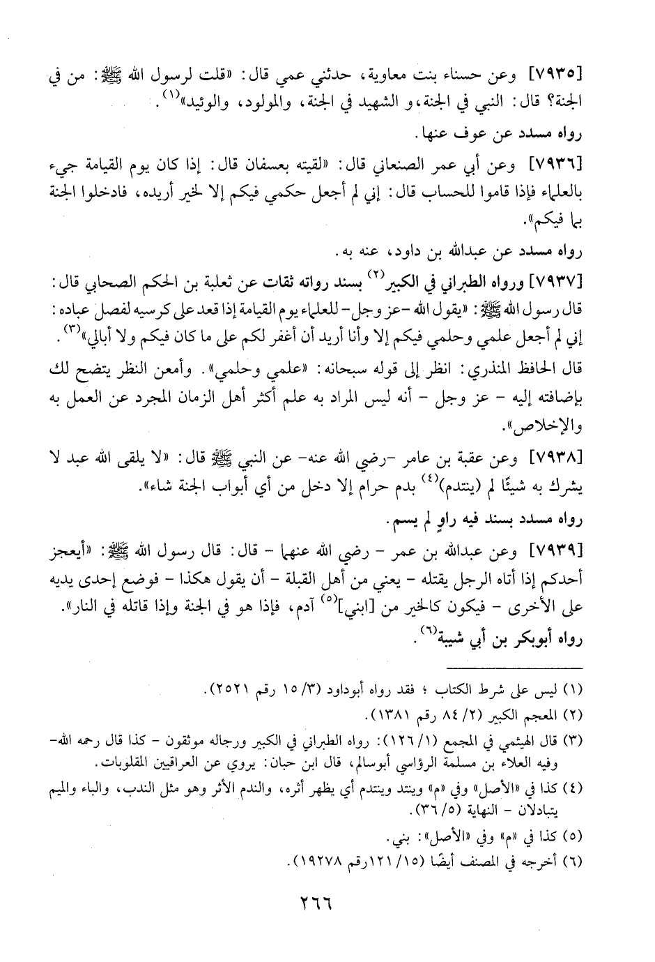 7935 - وعن حسناء بنت معاوية، حدثني عمي قالت: "قُلْتُ لِرَسُولِ اللَّهِ - صَلَّى اللَّهُ عَلَيْهِ وَسَلَّمَ -: مَنْ فِي الْجَنَّةِ؟ قَالَ: النَّبِيُّ فِي الْجَنَّةِ، وَالشَّهِيدُ فِي الْجَنَّةِ، وَالْمَوْلُودُ، وَالْوَئِيدُ".
