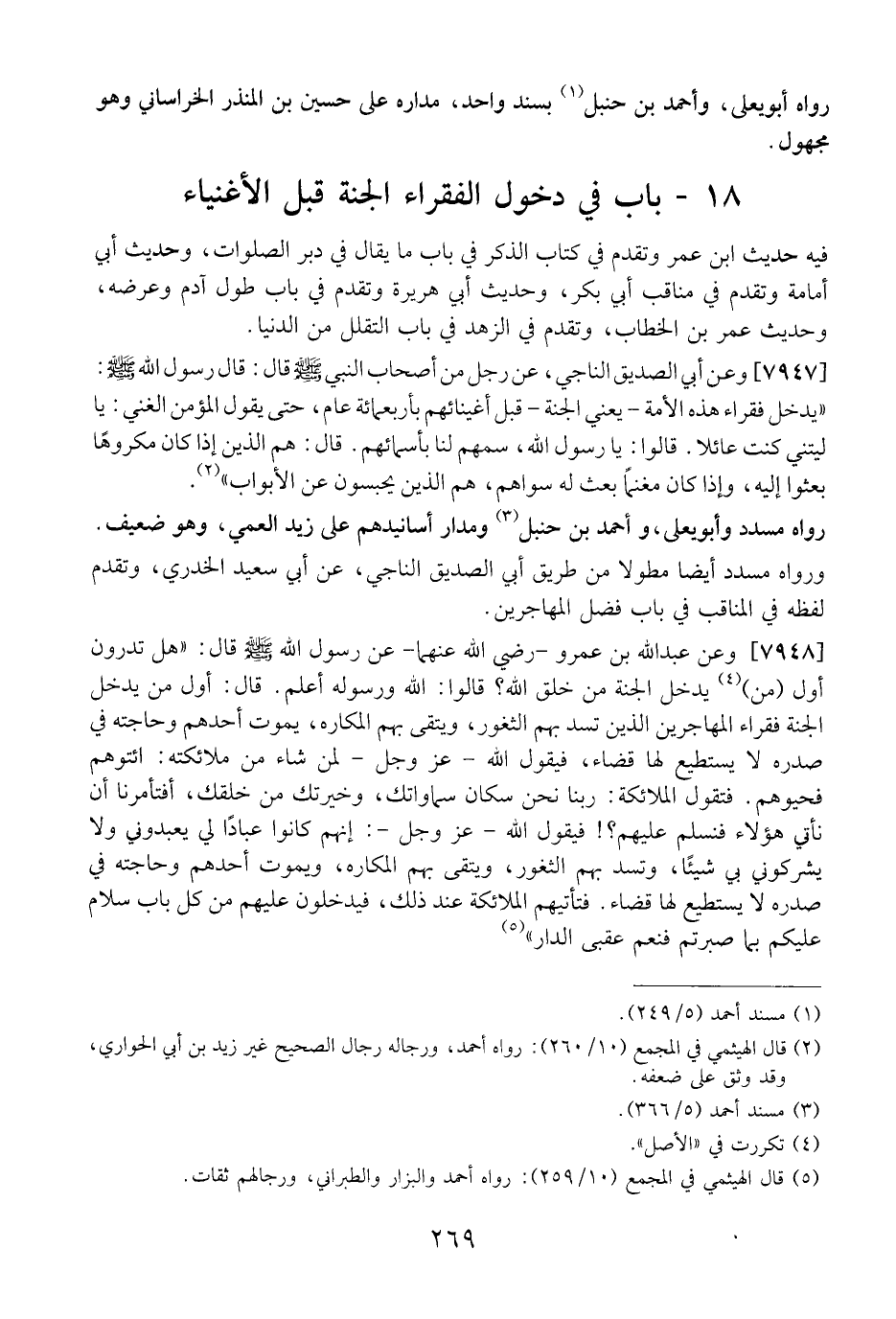 7947 - وَعَنْ أَبِي الصِّدِّيقِ النَّاجِيِّ، عَنْ رَجُلٍ مِنْ أَصْحَابِ النَّبِيِّ - صَلَّى اللَّهُ عَلَيْهِ وَسَلَّمَ - قَالَ: قَالَ رَسُولُ اللَّهِ - صَلَّى اللَّهُ عَلَيْهِ وَسَلَّمَ -: "يَدْخُلُ فُقَرَاءُ هَذِهِ الْأُمَّةَ- يعني الجنة- قبل أغينائهم بأربعمائة عَامٍ، حَتَّى يَقُولُ الْمُؤْمِنُ الْغَنِيُّ: يَا لَيْتَنِي كُنْتُ عَائِلًا. قَالُوا: يَا رَسُولَ اللَّهِ، سَمِّهِمْ لَنَا بِأَسْمَائِهِمْ. قَالَ: هُمُ الَّذِينَ إِذَا كَانَ مَكْرُوهًا بُعِثُوا إِلَيْهِ، وَإِذَا كَانَ مَغْنَمًا بُعِثَ لَهُ سِوَاهُمْ، هُمُ الَّذِينُ يُحْبَسُونَ عَنِ الْأَبْوَابِ".