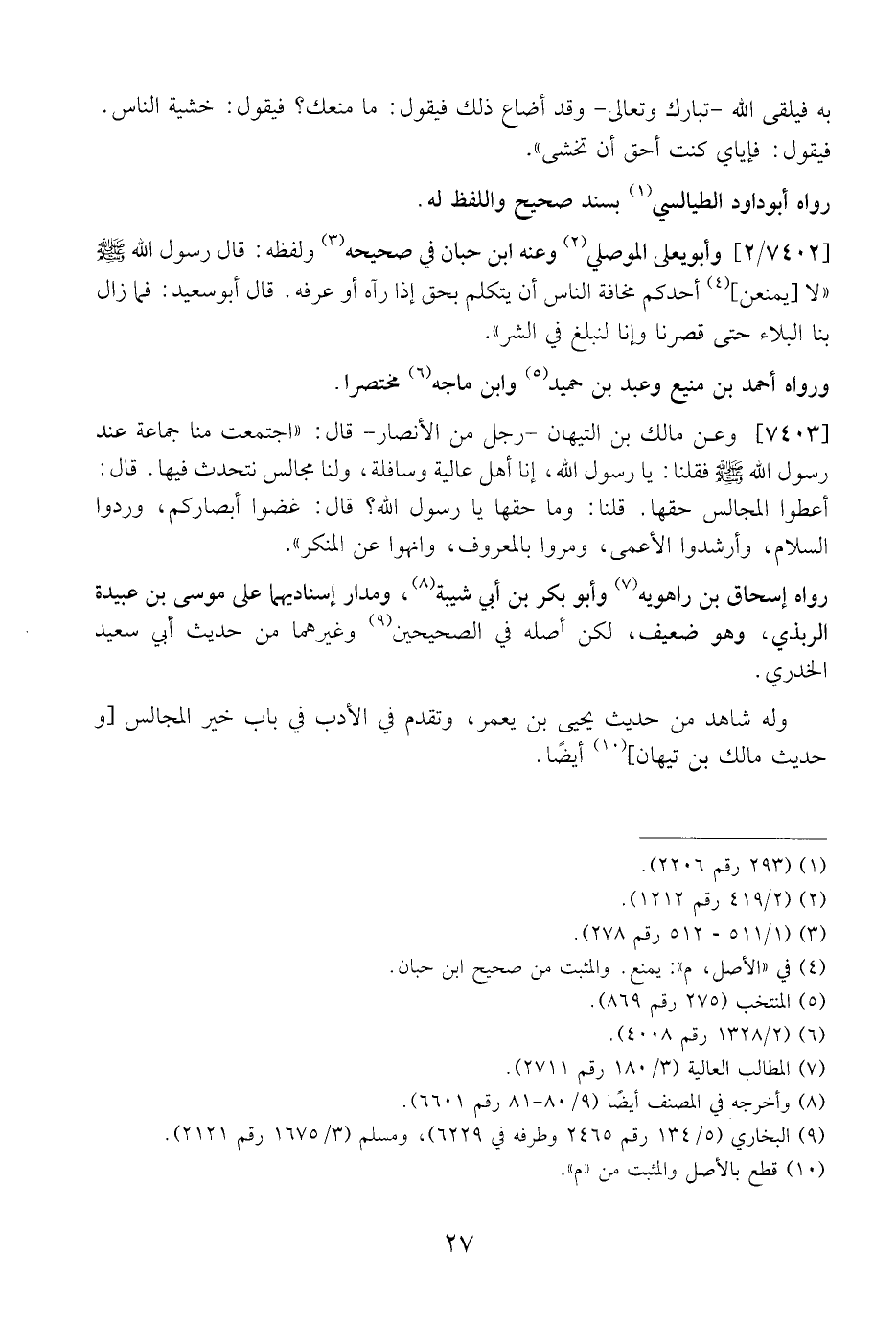 7403 - وَعَنْ مَالِكِ بْنِ التَّيِّهَانِ- رَجُلٍ مِنَ الْأَنْصَارِ- قَالَ: "اجْتَمَعَتْ مِنَّا جَمَاعَةٌ عِنْدَ رَسُولِ اللَّهِ - صَلَّى اللَّهُ عَلَيْهِ وَسَلَّمَ - فقلنا: يَا رَسُولَ اللَّهِ، إِنَّا أَهْلُ عَالِيَةٍ وَسَافِلَةٍ، وَلَنَا مَجَالِسُ نَتَحَدَّثُ فِيهَا. قَالَ: أَعْطُوا الْمَجَالِسَ حَقَّهَا. قُلْنَا: وَمَا حَقُّهَا يَا رَسُولَ اللَّهِ؟ قَالَ: غُضُّوا أَبْصَارَكُمْ، وَرُدُّوا السَّلَامَ، وَأَرْشِدُوا الْأَعْمَى، وَمُرُوا بِالْمَعْرُوفِ، وَانْهَوْا عَنِ الْمُنْكَرِ".