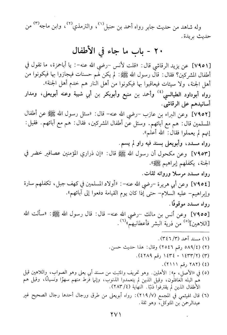 7951 - عَنْ يَزِيدَ الرَّقَاشِيِّ قَالَ: "قُلْتُ لِأَنَسٍ- رَضِيَ اللَّهُ عنه-: يا أباحمزة، مَا تَقُولُ فِي أَطْفَالِ الْمُشْرِكِينَ؟ فَقَالَ: قَالَ رَسُولُ اللَّهِ - صَلَّى اللَّهُ عَلَيْهِ وسلم -: لم يكن لهم حسنات فيجازوا بِهَا فَيَكُونُوا مِنْ أَهْلِ الْجَنَّةِ، وَلَا سَيِّئَاتٌ فيعاقبوا بها فيكونوا من أهل النار هم خدم أهل الجنة".
