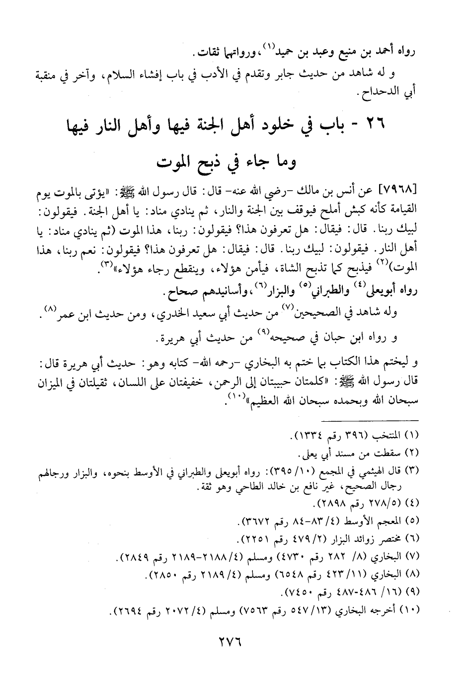 7968 - عَنْ أَنَسِ بْنِ مَالِكٍ- رَضِيَ اللَّهُ عَنْهُ- قَالَ: قَالَ رَسُولُ اللَّهِ - صَلَّى اللَّهُ عَلَيْهِ وسلم -: "يؤتى بالموت يوم القيامة كأنه كبش أملح فيوقف بين الجنة والنار، ثم ينادي مناد: يا أهل الجنة. فَيَقُولُونَ: لَبَّيْكَ رَبَّنَا. قَالَ: فَيُقَالُ: هَلْ تَعْرِفُونَ هذا؟ فيقولون: رَبَّنَا، هَذَا الْمَوْتُ (ثُمَّ يُنَادِي مُنَادٍ: يَا أَهْلَ النَّارِ. فَيَقُولُونَ: لَبَّيْكَ رَبَّنَا. قَالَ: فَيُقَالُ: هَلْ تَعْرِفُونَ هَذَا؟ فَيَقُولُونَ: نَعَمْ رَبَّنَا، هَذَا الْمَوتُ فَيُذْبَحُ كَمَا تُذْبَحُ الشَّاةُ، فَيَأْمَنُ هَؤُلَاءِ، وَيَنْقَطِعُ رَجَاءُ هَؤُلَاءِ".