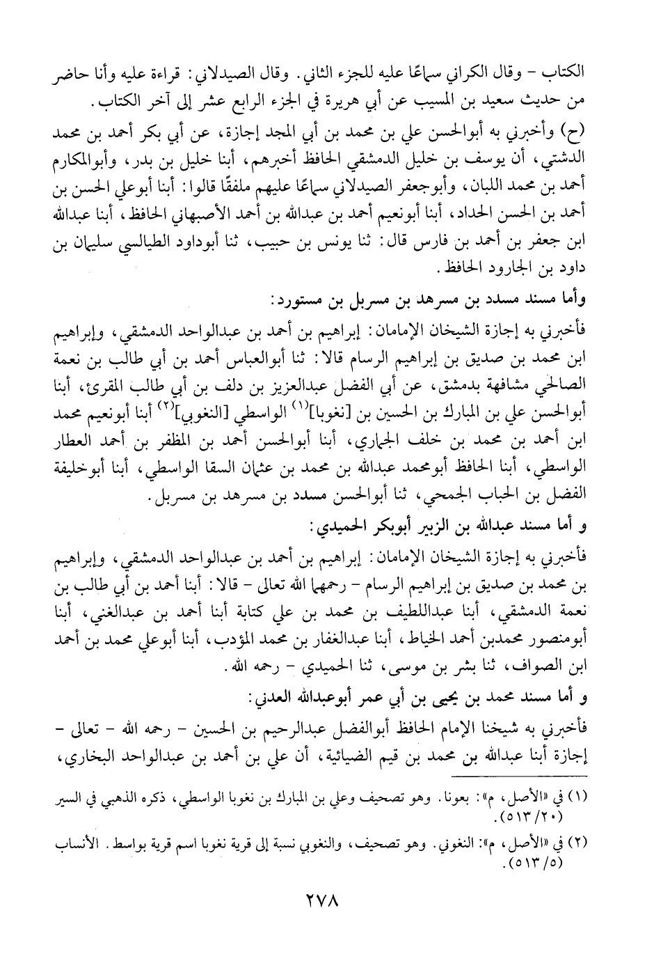 فأخبرني به إجازة الشيخان الإمامان: إبراهيم بن أحمد بن عبد الواحد الدمشقي، وابراهيم بن محمد بن صديق بن إبراهيم الرسام- رحمهما الله تعالى- قالا: أبنا أحمد بن أبي طالب بن نعمة الدمشقي، أبنا عبد اللطيف بن محمد بن علي كتابة أبنا أحمد بن عبد الغني، أبنا أبو منصور محمد بن أحمد الخياط، أبنا عبد الغفار بن محمد المؤدب، أبنا أبو علي محمد بن أحمد ابن الصواف، ثنا بشر بن موسى، ثنا الحميدي- رحمه الله.
