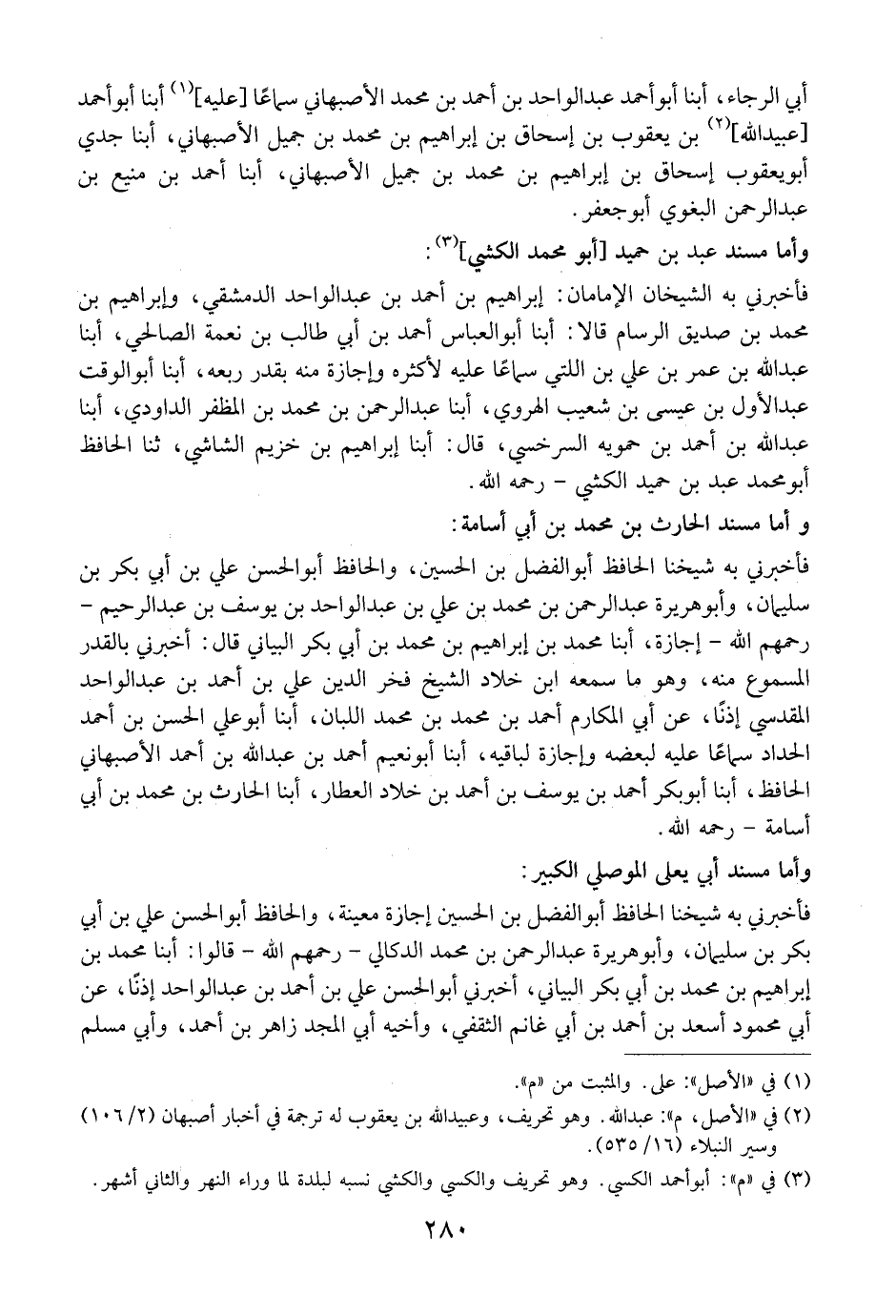 فأخبرني به شيخنا الإمام حافظ العصر عبد الرحيم بن الحسين- رحمه الله- إجازة، أبنا عبد الله بن محمد بن القيم، وأبو عبد الله بن محمد بن إبراهيم بن محمد بن أبي بكر البياني قالا: أبنا بالقدر المسموع منه والباقي إجازة أبو الحسن علي بن أحمد بن عبد الواحد، عن المؤيد بن عبد الرحيم بن الأخوة وأبي عبد الله محمود بن أحمد بن عبد الرحمن الثقفي قالا: أبنا سعيد بن أبي الرجاء، أبنا أبو أحمد عبد الواحد بن أحمد بن محمد الأصبهاني سماعًا أعليه، أبنا أبو أحمد عبيد الله بن يعقوب بن إسحاق بن إبراهيم بن محمد بن جميل الأصبهاني، أبنا جدي أبو يعقوب إسحاق بن إبراهيم بن محمد بن جميل الأصبهاني، أبنا أحمد بن منيع بن عبد الرحمن البغوي أبو جعفر.