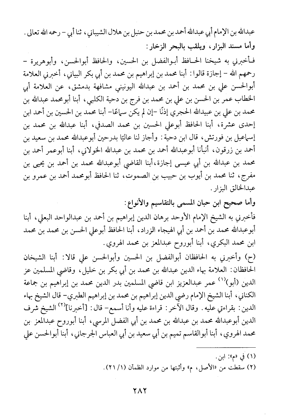 فأخبرني به شيخنا الحافظ أبو الفضل بن الحسين، والحافظ أبو الحسن، وأبو هريرة- رحمهم الله- إجازة قالوا: أبنا محمد بن إبراهيم بن محمد بن أبي بكر البياني، أخبرني العلامة أبو الحسن علي بن محمد بن أحمد بن عبد الله اليونيني مشافهة بدمشق، عن العلامة أبي الخطاب عمر بن الحسن بن علي بن محمد بن فرج بن دحية الكلبي، أبنا أَبُو مُحَمَّدٍ عَبْدِ اللَّهِ بْنِ مُحَمَّدِ بْنِ عَلِيِّ بْنِ عبيد الله الحجري إذنًا- إن لم يكن سماعًا- أبنا محمد بن الحسين بن أحمد ابن إحدى عشرة، أبنا الحافظ أبو علي الحسين بن محمد الصدفي، أبنا عبد الله بن محمد بن إسماعيل بن فورتشْ، قال ابن دحية: وأجاز لنا عاليًا بدرحين أبو عبد الله محمد بن سعيد بن أحمد بن زرقولت، أنبأنا أبو عبد الله أحمد بن محمد بن عبد الله الخولاني، أبنا أبو عمر أحمد بن محمد بن عبد الله بن أبي عيسى إجازة، أبنا القاضي أبو عبد الله محمد بن أحمد بن يحيى بن مفرج، ثنا محمد بن أيوب بن حبيب بن الصموت، ثنا الحافظ أبو محمد أحمد بن عمرو بن عبد الخالق البزار.