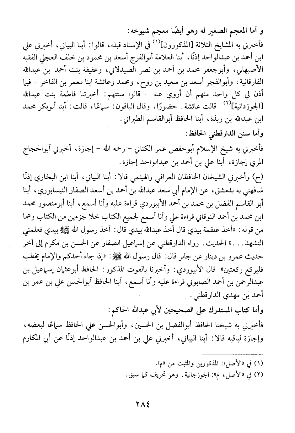 (ح) وأخبرني الشيخان الحافظان العراقي والهيثمي قالا: أبنا البياني، أبنا ابن البخاري إذنًا شافهني به بدمشق، عن الإمام أبي سعد عبد الله بن أحمد بن أسعد الصفار النيسابوري، أبنا أبو القاسم الفضل بن محمد بن أحمد الأبيوردي قراءة عليه وأنا أسمع، أبنا أبو منصور محمد ابن محمد بن أحمد النوقاني قراءة علي وأنا أسمع لجميع الكتاب خلا جزءين من الكتاب وهما من قوله: "أخذ علقمة بيدي قال أخذ عبد الله بيدي قَالَ: أَخَذَ رَسُولُ اللَّهِ - صَلَّى اللَّهُ عَلَيْهِ وَسَلَّمَ - بيدي فعلمني التشهد ... " الحديث. رواه الدارقطني عن إسماعيل الصفار عن الحسن بن مكرم إلى آخر حديث عمرو بْنِ دِينَارٍ عَنْ جَابِرٍ قَالَ: قَالَ رَسُولُ اللَّهِ - صَلَّى اللَّهُ عَلَيْهِ وسلم -: "إذا جاء أحدكم والإمام يخطب فليركع ركعتين" قال الأبيوردي: وأخبرنا بالفوت المذكور: الحافظ أبو عثمان إسمماعيل بن عبد الرحمن بن أحمد الصابوني قراءة عليه وأنا أسمع، أبنا الحافظ أبو الحسن علي بن عمر بن أحمد بن مهدي الدارقطني.