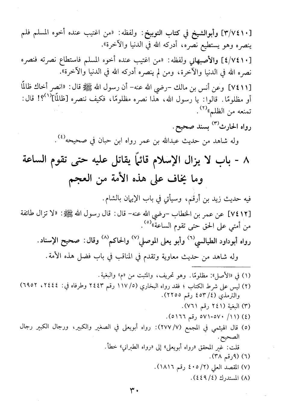 7410 / 4 - والأصبهاني ولفظه: "من اغتيب عنده أخوه المسلم فَاسْتَطَاعَ نُصْرَتَهُ فَنَصَرَهُ نَصَرَهُ اللَّهُ فِي الدُّنْيَا وَالْآخِرَةِ، وَمَنْ لَمْ يَنْصُرْهُ أَدْرَكَهُ اللَّهُ فِي الدُّنْيَا وَالْآخِرَةِ".
