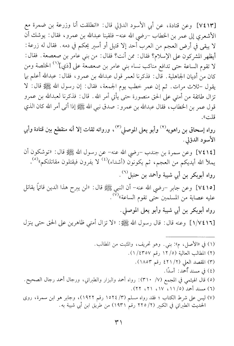 7413 - وعن قتادة، عن أبي الأسود الدؤلي قَالَ: "انْطَلَقْتُ أَنَا وَزُرْعَةُ بْنُ ضَمْرَةَ مَعَ الْأَشْعَرِيِّ إِلَى عُمَرَ بْنِ الْخَطَّابِ- رَضِيَ اللَّهُ عَنْهُ- فَلَقِينَا عَبْدَ اللَّهِ بْنَ عَمْرٍو، فَقَالَ: يُوشِكُ أَنْ لَا يَبْقَى فِي أَرْضِ الْعَجَمِ مِنَ الْعَرَبِ أَحَدٌ إِلَّا قَتِيلٌ أَوْ أَسِيرٌ يُحْكَمُ فِي دَمِهِ. فَقَالَ لَهُ زُرْعَةُ: أَيَظْهَرُ المشركون على الْإِسْلَامِ؟ فَقَالَ: مِمَّنْ أَنْتَ؟ فَقَالَ: مِنْ بَنِي عَامِرِ بْنِ صَعْصَعَةَ. فَقَالَ: لَا تَقُومُ السَّاعَةُ حَتَّى تُدَافِعَ مَنَاكِبُ نِسَاءِ بَنِي عَامِرِ بْنِ صَعْصَعَةَ عَلَى ذِي الْخَلَصَةِ وَمَنْ كَانَ مِنْ أديان الجاهلية. قال: فذكرنا لعمر قَوْلِ عَبْدِ اللَّهِ بْنِ عَمِرٍو، فَقَالَ: عَبْدُ اللَّهِ أَعْلَمُ بِمَا يَقُولُ- ثَلَاثَ مَرَّاتٍ. ثُمَّ إِنَّ عُمَرَ خَطَبَ يَوْمَ الْجُمُعَةِ، فَقَالَ: إِنَّ رَسُولَ اللَّهِ - صَلَّى اللَّهُ عَلَيْهِ وَسَلَّمَ - قَالَ: لَا تَزَالُ طَائِفَةٌ مِنْ أُمَّتِي عَلَى الْحَقِّ مَنْصُورَةٌ حَتَّى يَأْتِيَ أَمْرُ اللَّهِ. قَالَ: فَذَكَرْنَا لِعَبْدِ اللَّهِ بْنِ عَمْرٍو قَوْلَ عُمَرَ بْنِ الْخَطَّابِ، فَقَالَ عَبْدُ اللَّهِ بْنُ عَمْرٍو: صَدَقَ نَبِيُّ اللَّهِ - صَلَّى اللَّهُ عَلَيْهِ وَسَلَّمَ - إِذَا أَتَى أَمْرُ اللَّهِ كَانَ الَّذِي قُلْتُ".