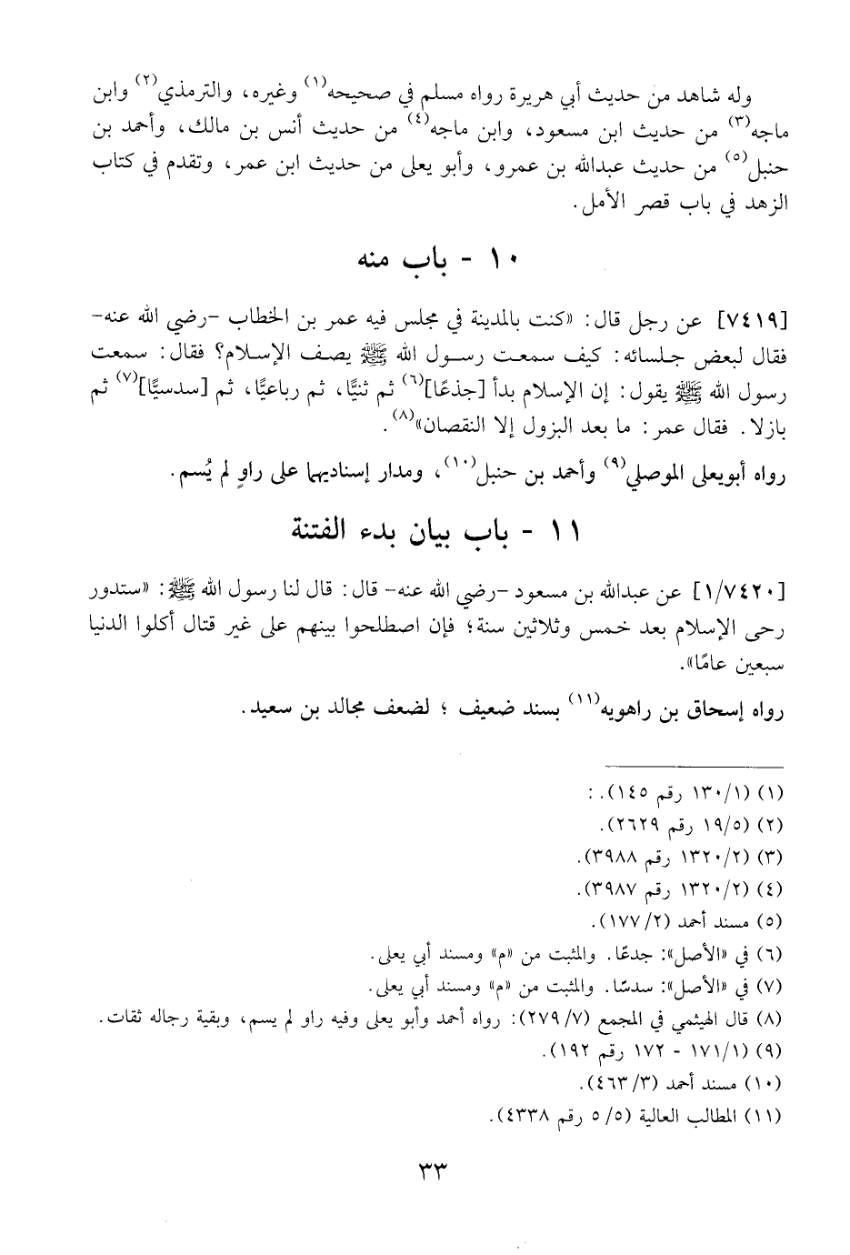 7420 / 1 - عَنْ عَبْدِ اللَّهِ بْنِ مَسْعُودٍ- رَضِيَ اللَّهُ عَنْهُ- قَالَ: قَالَ لَنَا رَسُولُ اللَّهِ قيل: ستدور رحى الْإِسْلَامِ بَعْدَ خَمْسٍ وَثَلَاثِينَ سَنَةً، فَإِنِ اصْطَلَحُوا بينهم على غير قتالا أَكَلُوا الدُّنْيَا سَبْعِينَ عَامًا".