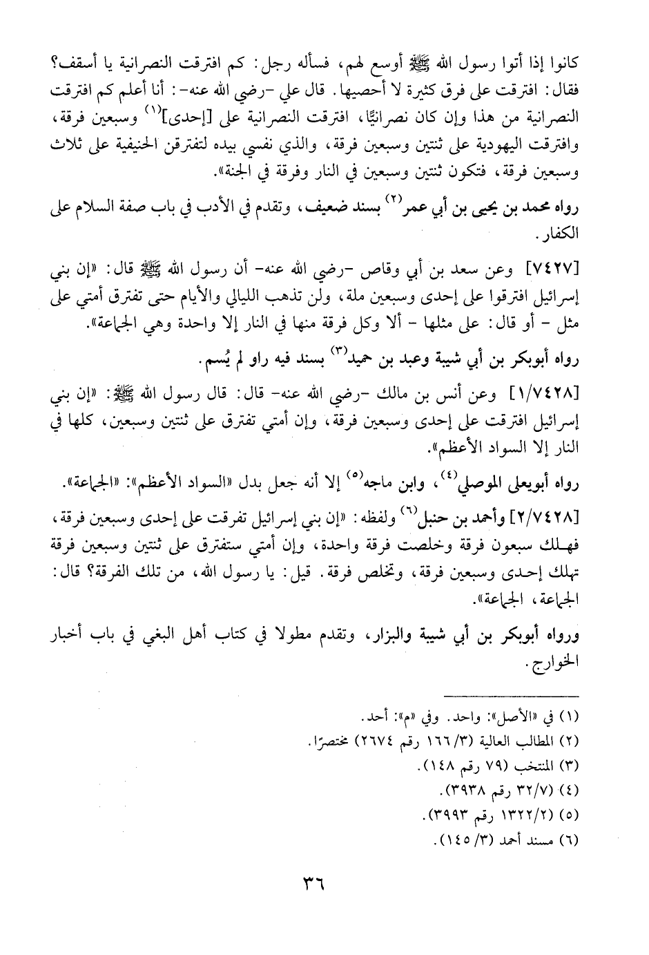 7428 / 2 - وَأَحْمَدُ بْنُ حَنْبَلٍ وَلَفْظُهُ: "إِنَّ بَنِي إِسْرَائِيلَ تَفَرَّقَتْ عَلَى إِحَدَى وَسَبْعِينَ فِرْقَةً، فَهَلَكَ سَبْعُونَ فِرْقَةً وَخَلُصَتْ فِرْقَةٌ وَاحِدَةٌ، وَإِنَّ أُمَّتِي سَتَفْتَرِقُ عَلَى ثنتين وسبعين فرقة تهلك إحدى وسبعين فِرْقَةً، وَتَخْلُصُ فِرْقَةٌ. قِيلَ: يَا رَسُولَ اللَّهِ، مَنْ تِلْكَ الْفِرْقَةُ؟ قَالَ: الجماعة، الْجَمَاعَةِ".