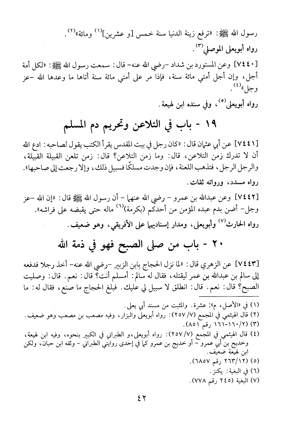 7440 - عَنْ أَبِي عُثْمَانَ قَالَ: "كَانَ رَجُلٌ فِي بَيْتِ الْمَقْدِسِ يَقْرَأُ الْكُتُبَ يَقُولُ لِصَاحِبِهِ: ادْعُ اللَّهَ أَنْ لَا تُدْرِكَ زَمَنَ التَّلَاعُنِ، قَالَ: وَمَا زَمَنُ التَّلَاعُنِ؟ قَالَ: زَمَنٌ تَلْعَنُ الْقَبِيلَةُ الْقَبِيلَةَ، وَالرَّجُلُ الرَّجُلَ، فَتَذْهَبُ اللَّعْنَةُ، فَإِنْ وَجَدَتْ مَسْلَكًا فَسَبِيلُ ذَلِكَ، وَإِلَّا رَجَعَتْ إِلَى صَاحِبِهَا".