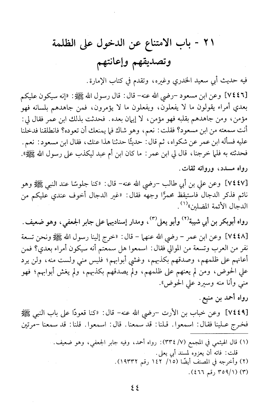 7446 - وَعَنِ ابْنِ مَسْعُودٍ- رَضِيَ اللَّهُ عَنْهُ- قَالَ: قَالَ رَسُولُ اللَّهِ - صَلَّى اللَّهُ عَلَيْهِ وَسَلَّمَ -: "أَنَّهُ سَيَكُونُ عَلَيْكُمْ بَعْدِي أُمَرَاءُ يَقُولُونَ مَا لَا يَفْعَلُونَ، وَيَفْعَلُونَ مَا لَا يُؤْمَرُونَ، فَمَنْ جَاهَدَهُمْ بِلِسَانِهِ فَهُوَ مُؤْمِنٌ، وَمَنْ جَاهَدَهُمْ بِقَلْبِهِ فَهُوَ مُؤْمِنٌ، لَا إِيمَانَ بَعْدَهُ. فَحَدَّثْتُ بِذَلِكَ ابْنَ عُمَرَ فَقَالَ لِي: أنْتَ سَمِعْتَهُ مِنِ ابْنِ مَسْعُودٍ؟ فَقُلْتُ: نعم، وهو شاك فَمَا يَمْنَعُكَ أَنْ تَعُودَهُ؟ فَانْطَلَقْنَا فَدَخَلْنَا عَلَيْهِ فَسَأَلَهُ ابْنُ عُمَرَ عَنْ شَكْوَاهُ، ثُمَّ قَالَ: حَدِيثًا حَدَّثَنَا هَذَا عَنْكَ، فَقَالَ ابْنُ مَسْعُودٍ: نَعَمْ. فَحَدَّثْتُهُ بِهِ فَلَمَّا خَرَجْنَا، قَالَ لِي ابْنُ عُمَرَ: مَا كَانَ ابْنُ أُمِّ عَبْدٍ لِيَكْذِبَ عَلَى رَسُولِ اللَّهِ - صَلَّى اللَّهُ عَلَيْهِ وَسَلَّمَ -".