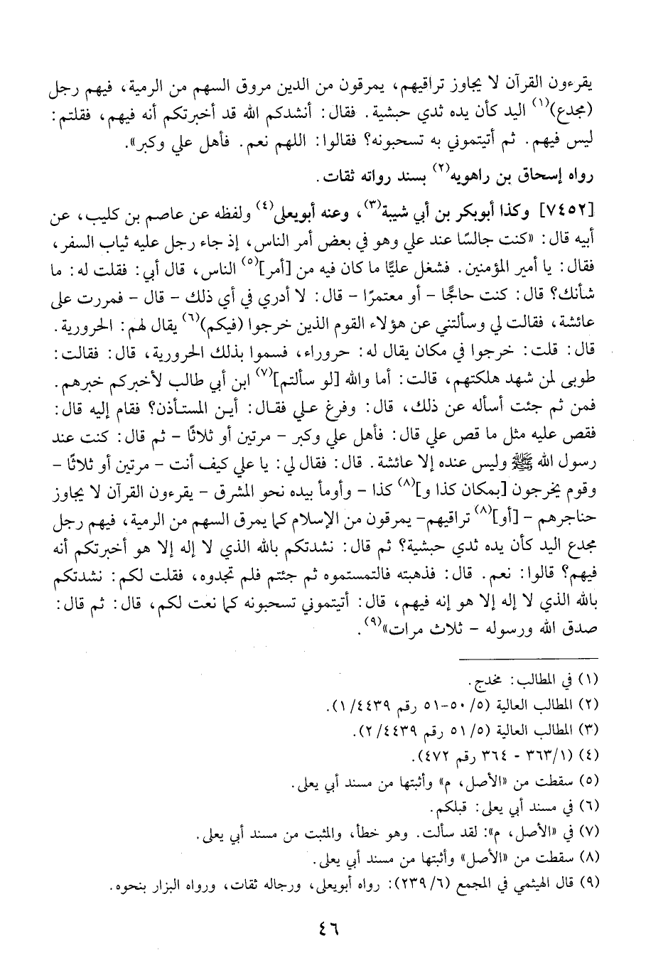 7452 - وكذا أَبُو بَكْرِ بْنُ أَبِي شَيْبَةَ، وَعَنْهُ أَبُو يعلى ولفظه عَنْ عَاصِمِ بْنِ كُلَيْبٍ، عَنْ أَبِيهِ قَالَ: "كنت جالسًا عند علي وهو في بعض أمر الناس، إذ جاء رجل عليه ثياب السفر، فقال: يا أمير المؤمنين. فشغل عليًّا ما كان فيه من أمر الناس، قال أبي: فقلت له: ما شأنك؟ قال: كنت حاجًّا- أو معتمرًا- قال: لا أدري في أي ذلك- قال- فمررت على عائشة، فقالت لي وسألتني عن هؤلاء القوم الذين خرجوا (فيكم) يقال لهم: الحرورية. قال: قلت: خرجوا في مكان يقال له: حروراء، فسموا بذلك الحرورية، قال: فقالت: طوبى لمن شهد هلكتهم، قالت: أما والله لو سألتم ابن أبي طالب لأخبركم خبرهم. فمن ثم جئت أسأله عن ذلك، قال: وفرغ علي فقال: أين المستأذن؟ فقام إليه قال: فقص عليه مثل ما قص علي قال: فأهل علي وكبر- مرتين أو ثلاثًا- ثم قَالَ: كُنْتُ عِنْدَ رَسُولِ اللَّهِ - صَلَّى اللَّهُ عَلَيْهِ وَسَلَّمَ -وليس عنده إلا عائشة. قال: فقال لي: يا علي كيف أنت- مرتين أو ثلاثًا- وقوم يخرجون بمكان كذا وكذا- وأومأ بيده نحو المشرق- يقرءون القرآن لا يجاوز حناجرهم- أو تَرَاقِيَهُمْ- يَمْرُقُونَ مِنَ الْإِسْلَامِ كَمَا يَمْرُقُ السَّهْمُ مِنَ الرمية، فيهم رجل مجدع اليد كأن يده ثدي حبشية؟ ثم قال: نشدتكم بالله الذي لا إله إلا هو أخبرتكم أنه فيهم؟ قالوا: نعم. قال: فذهبته فالتمستموه ثم جئتم فلم تجدوه، فقلت لكم: نشدتكم بالله الذي لا إله إلا هو إنه فيهم، قال: أتيتموني تسحبونه كما نعت لكم، قال: ثم قال: صدق الله ورسوله- ثلاث مرات".