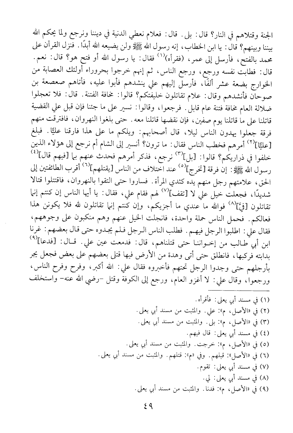 الجنة وقتلاهم في النار؟ قال: بلى. قال: فعلام نعطي الدنية في ديننا ونرجع ولم يحكم الله بيننا وبينهم؟ قال: يا ابن الخطاب، إني رسول الله ولن يضيعني أبدًا. فانطلق عمر فلم يصبر متغيظًا حتى أتى أبابكر، فقال: يا أبابكر، ألسنا على الحق وهم على الباطل؟ قال: بلى. قال: أليس قتلانا في الجنة وقتلاهم في النار؟ قال: بلى. قال: فعلام نعطي الدنية في ديننا ونرجع ولما يحكم الله بيننا وبينهم؟ قال: يا ابن الخطاب، أَنَّهُ رَسُولُ اللَّهِ - صَلَّى اللَّهُ عَلَيْهِ وَسَلَّمَ -ولن يضيعه الله أبدًا. فنزل القرآن على محمد بالفتح، فأرسل إلى عمر (فقرأه) فقال: يا رسول الله أو فتح هو؟ قال: نعم. قال: فطابت نفسه ورجِع، ورجع الناس، ثم إنهم خرجوا بحروراء أولئك العصابة من الخوارج بضعة عشر ألفَا، فأرسل إليهم علي ينشدهم فأبوا عليه، فأتاهم صعصعة بن صوحان فأنشدهم وقال: علام تقاتلون خليفتكم؟ قالوا: مخافة الفتنة. قال: فلا تعجلوا ضلالة العام مخافة فتنة عام قابل. فرجعوا، وقالوا: نسير على ما جئنا فإن قبل علي القضية قاتلنا على ما قاتلنا يوم صفين، فإن نقضها قاتلنا معه. حتى بلغوا النهروان، فافترقت منهم فرقة جعلوا يهدون الناس ليلا، قالت أصحابهم: ويلكم ما على هذا فارقنا عليًّا. فبلغ عليًّا، أمرهم فخطب الناس فقال: ما ترون؟ أنسير إلى الشام أم نرجع إلى هؤلاء الذين خلفوا في ذراريكم؟ قالوا: بل، نرجع، فذكر أمرهم فحدث عنهم بما فيهم قال، رسول الله - صلى الله عليه وسلم -: إن فرقة تخرج عند اختلاف من الناس يقتلهم (6) أقرب الطائفتين إلى الحق، علامتهم رجل منهم يده كثدي المرأة. فساروا حتى التقوا بالنهروان، فاقتتلوا قتالا شديدًا، فجعلت خيل علي لا تقف لهم فقام علي، فقال: يا أيها الناس إن كنتم إنما تقاتلون فيَّ فوالله ما عندي ما أجزيكم، وإن كنتم إنما تقاتلون لله فلا يكونن هذا فعالكم. فحمل الناس حملة واحدة، فانجلت الخيل عنهم وهم منكبون على وجوههم، فقال علي: اطلبوا الرجل فيهم. فطلب الناس الرجل فلم يجدوه حتى قال بعضهم: غرنا ابن أبي طالب من إخواننا حتى قتلناهم، قال: فدمعت عين علي. قال: فدعا بدابته فركبها، فانطلق حتى أتى وهدة من الأرض فيها قتلى بعضهم على بعض فجعل يجر بأرجلهم حتى وجدوا الرجل تحتهم فأخبروه فقال علي: الله أكبر، وفرح وفرح الناس، ورجعوا، وقال علي: لا أغزو العام، ورجع إلى الكوفة وقتل- رضي الله عنه- واستخلف