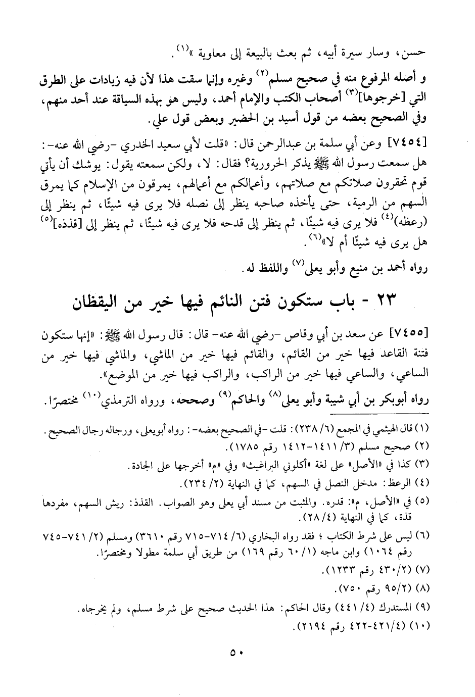 7455 - عَنْ سَعْدِ بْنِ أَبِي وَقَّاصٍ- رَضِيَ اللَّهُ عَنْهُ- قَالَ: قَالَ رَسُولُ اللَّهِ - صَلَّى اللَّهُ عَلَيْهِ وسلم -: "إنها ستكون فِتْنَةٌ الْقَاعِدُ فِيهَا خَيْرٌ مِنَ الْقَائِمِ، وَالْقَائِمُ فِيهَا خَيْرٌ مِنَ الْمَاشِي، وَالْمَاشِي فِيهَا خَيْرٌ من الساعي، والساعي فيها خير من الراكب، والراكب فيها خير من الموضع".